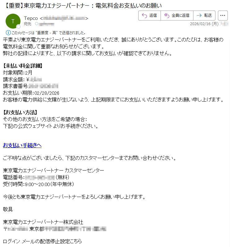 東京電力エナジーパートナーになりすました偽メール「件名:【重要】東京電力エナジーパートナー:電気料金お支払いのお願い」(本偽メールは、実在の企業と無関係に送信されたものです)