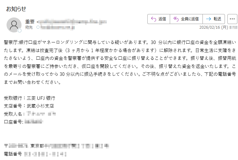 2026年2月16日現在、以下の迷惑メール・詐欺メールが送信されているので気をつけてください。