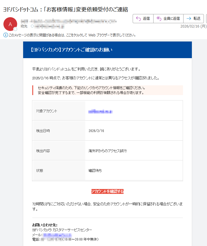 ヨドバシカメラになりすました偽メール「件名:ヨドバシドットコム:「お客様情報」変更依頼受付のご連絡」(本偽メールは、実在の企業と無関係に送信されたものです)