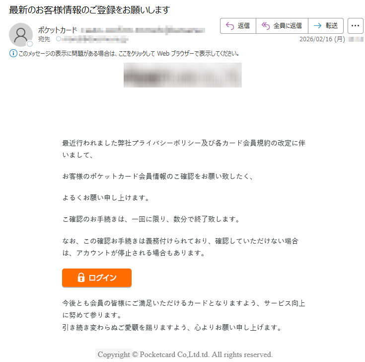 ポケットカードになりすました偽メール「件名:最新のお客様情報のご登録をお願いします」(本偽メールは、実在の企業と無関係に送信されたものです)