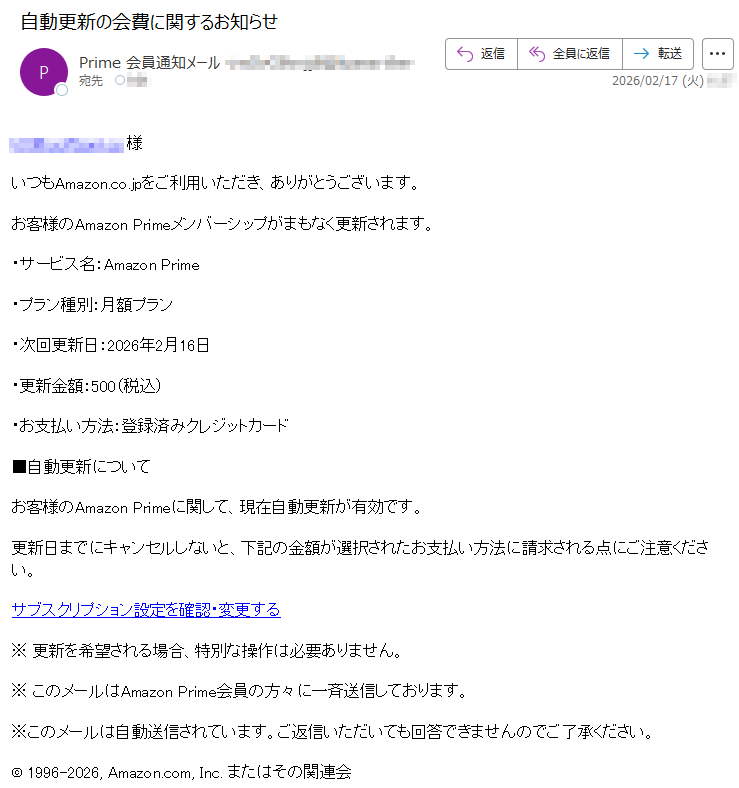 Amazon Primeの会費のお支払いに関する重なお知らせ