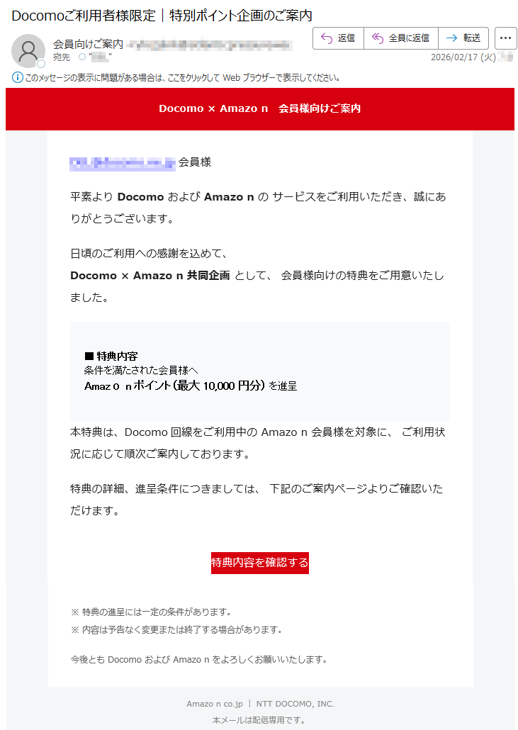 NTTドコモになりすました偽メール「件名:Docomoご利用者様限定|特別ポイント企画のご案内」(本偽メールは、実在の企業と無関係に送信されたものです)