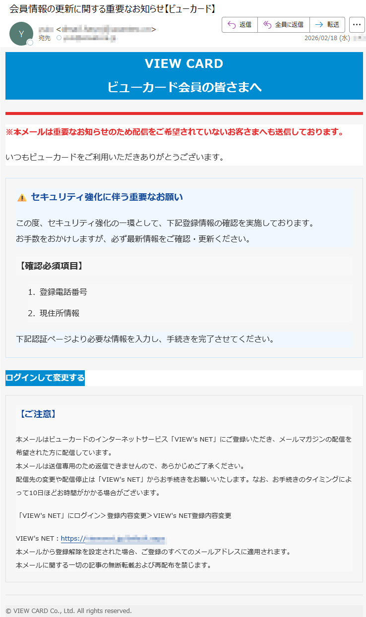 ビューカードになりすました偽メール「件名:会員情報の更新に関する重要なお知らせ【ビューカード】」(本偽メールは、実在の企業と無関係に送信されたものです)