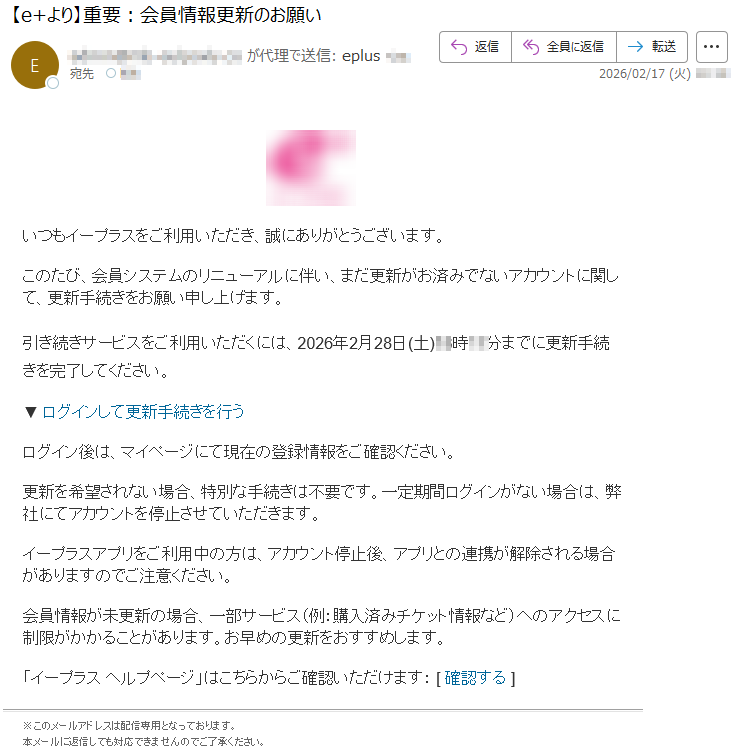 ![いつもイープラスをご利用いただき、誠にありがとうございます。このたび、会員システムのリニューアルに伴い、まだ更新がお済みでないアカウントに関して、更新手続きをお願い申し上げます。引き続きサービスをご利用いただくには、2026年2月28日(土)**時**分までに更新手続きを完了してください。▼ログインして更新手続きを行うログイン後は、マイページにて現在の登録情報をご確認ください。更新を希望されない場合、特別な手続きは不要です。一定期間ログインがない場合は、弊社にてアカウントを停止させていただきます。イープラスアプリをご利用中の方は、アカウント停止後、アプリとの連携が解除される場合がありますのでご注意ください。会員情報が未更新の場合、一部サービス(例:購入済みチケット情報など)へのアクセスに制限がかかることがあります。お早めの更新をおすすめします。「イープラスヘルプページ」はこちらからご確認いただけます:[確認する]※このメールアドレスは配信専用となっております。本メールに返信しても対応できませんのでご了承ください。](../../images/alert/2026/2m/nise_mail0218_10.png)