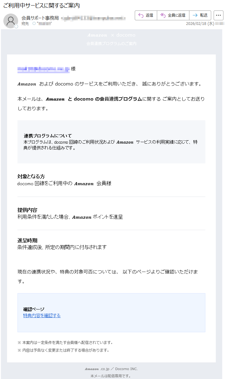 アマゾン、NTTドコモになりすました偽メール「件名:ご利用中サービスに関するご案内」(本偽メールは、実在の企業と無関係に送信されたものです)