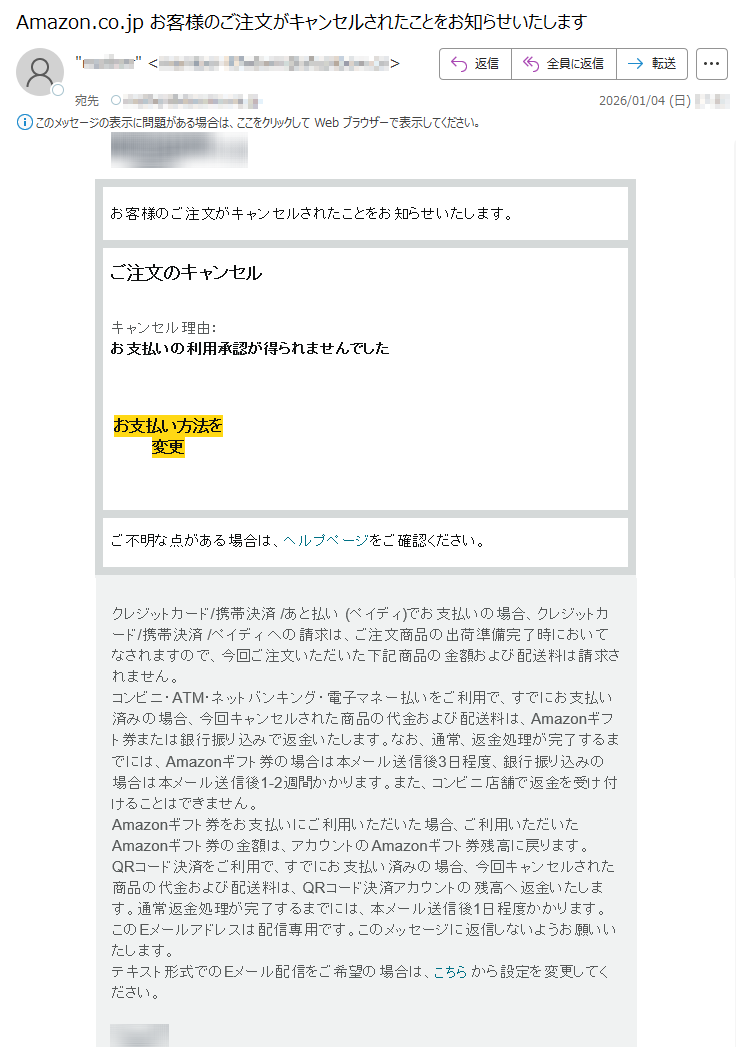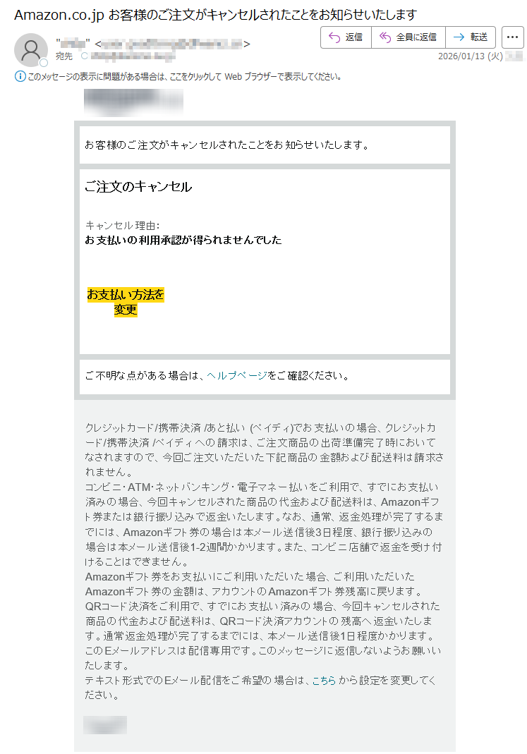 アマゾンになりすました偽メール「件名:お支払いの利用承認が得られませんでした」(本偽メールは、実在の企業と無関係に送信されたものです)