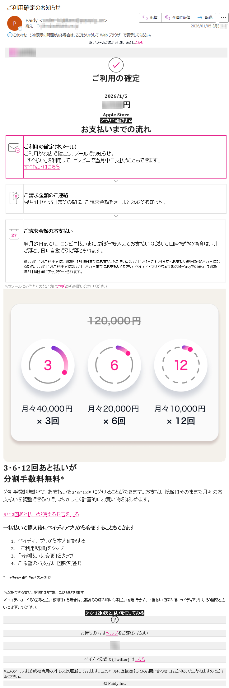 ペイディになりすました偽メール「件名:ご利用確定のお知らせ」(本偽メールは、実在の企業と無関係に送信されたものです)