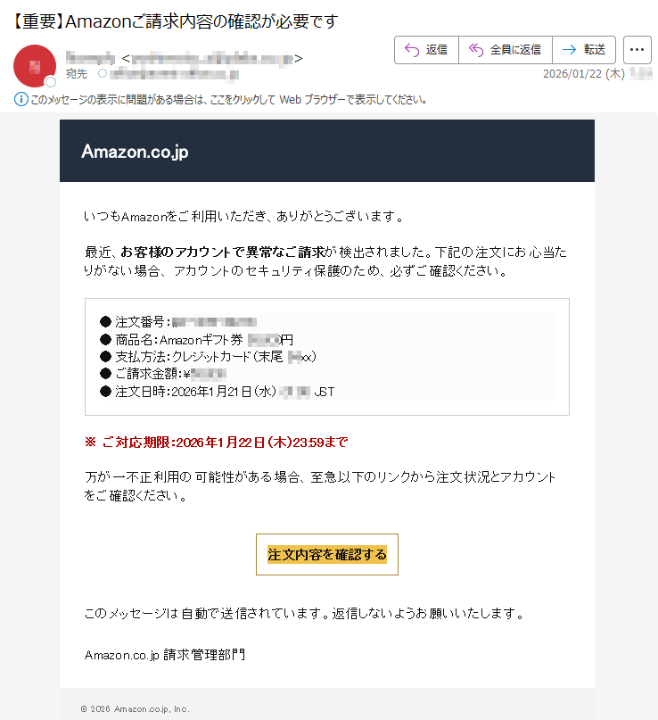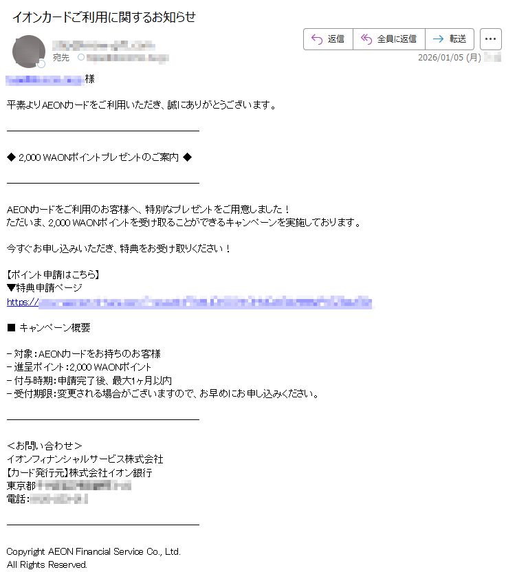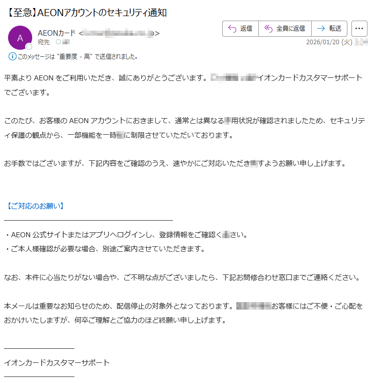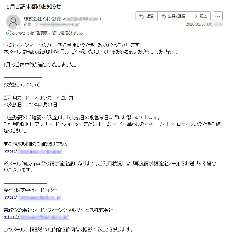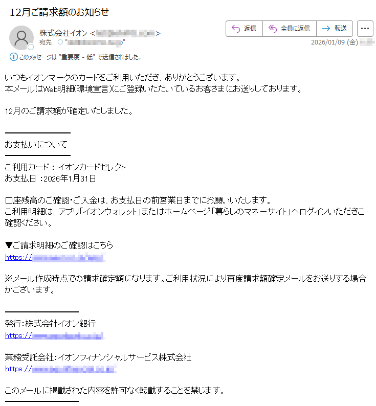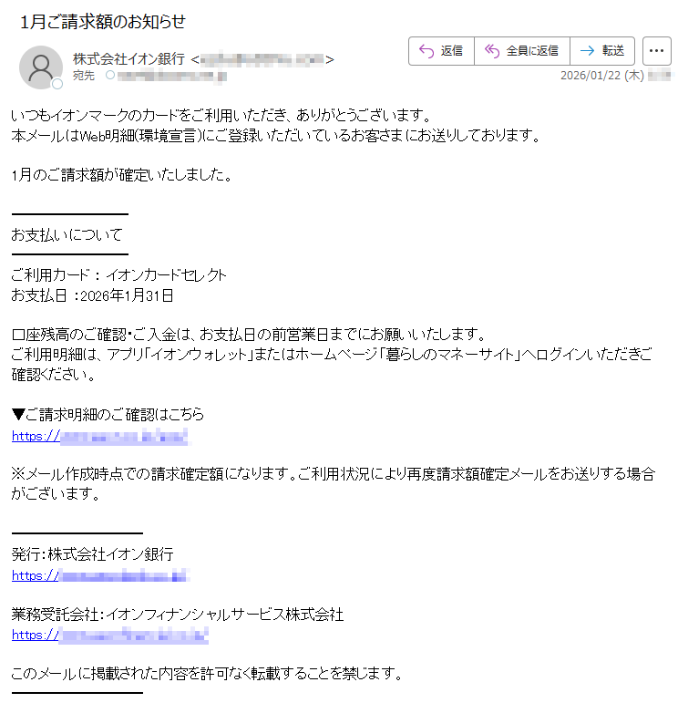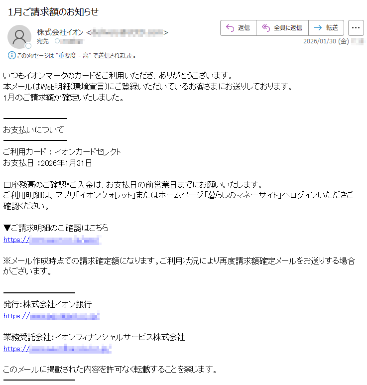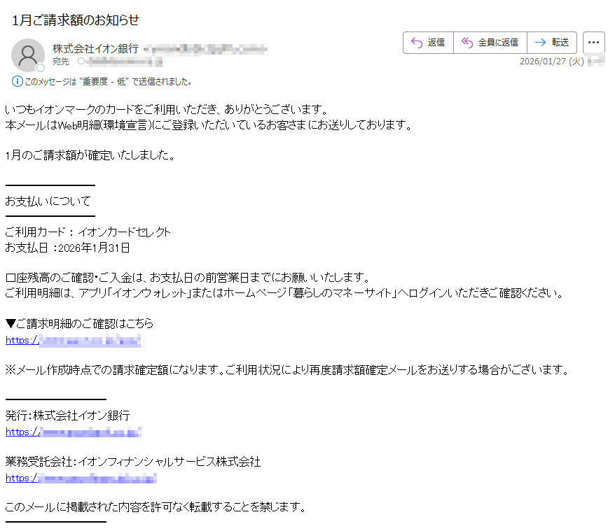 イオンカードになりすました偽メール「件名:1月ご請求額のお知らせ」(本偽メールは、実在の企業と無関係に送信されたものです)