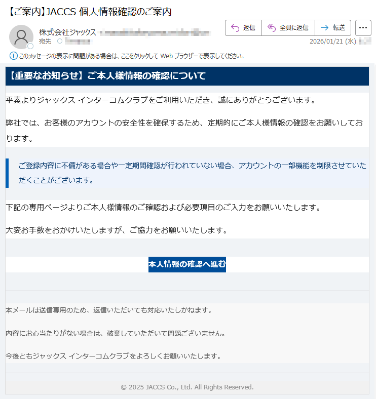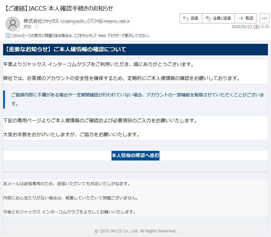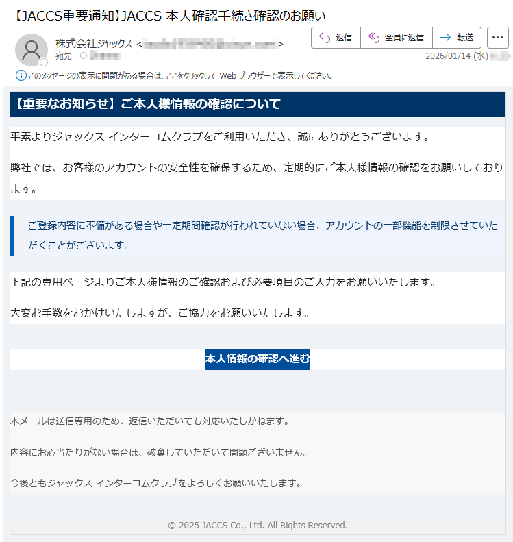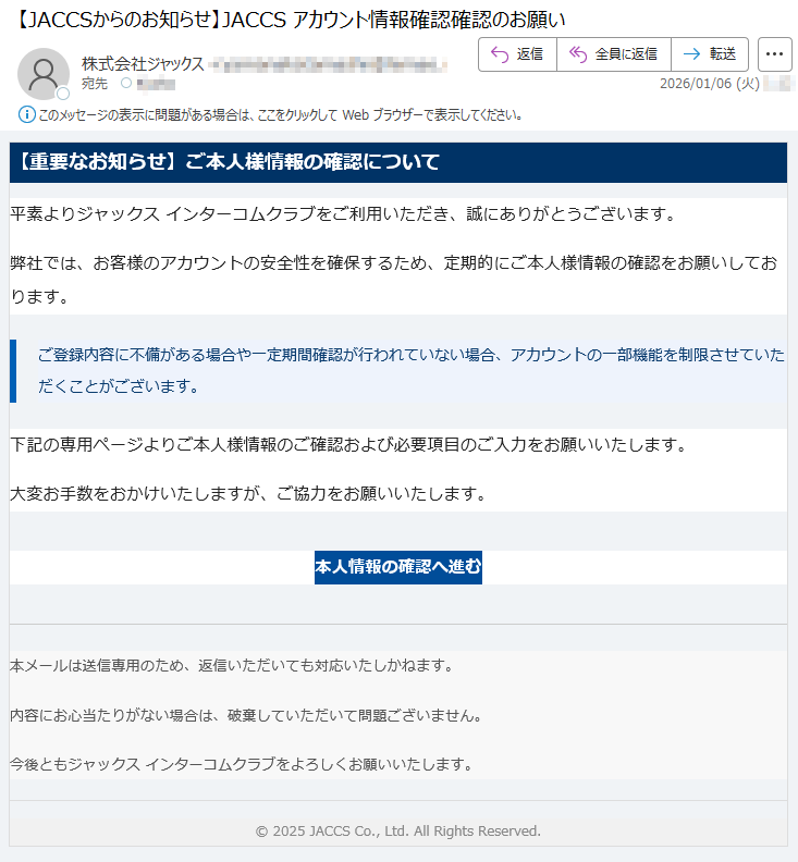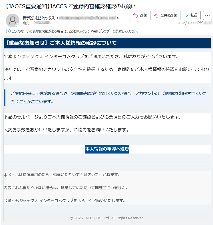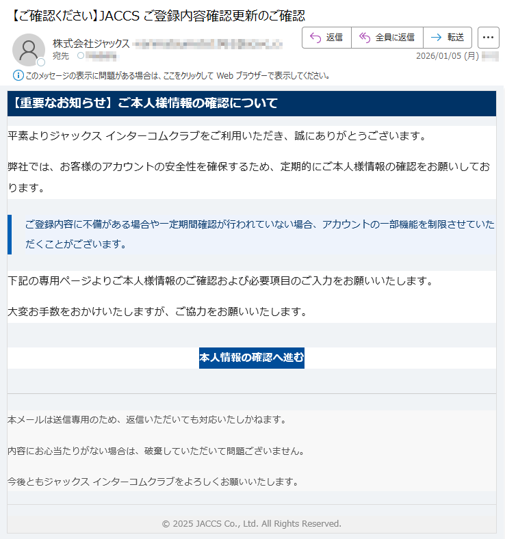 ジャックスカードになりすました偽メール「件名:【ご確認ください】JACCS ご登録内容確認更新のご確認」(本偽メールは、実在の企業と無関係に送信されたものです)