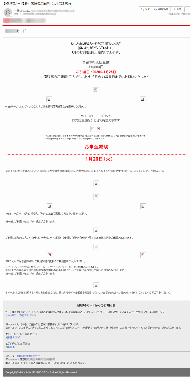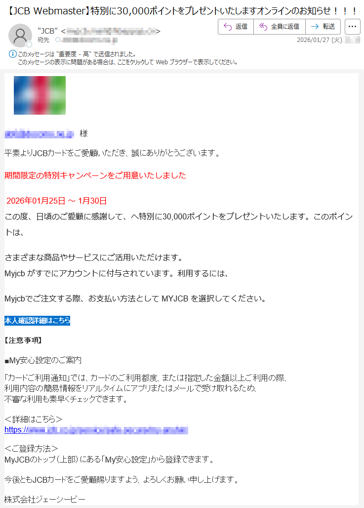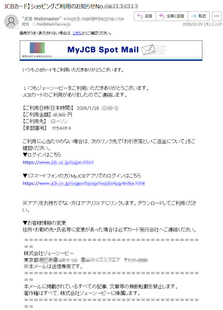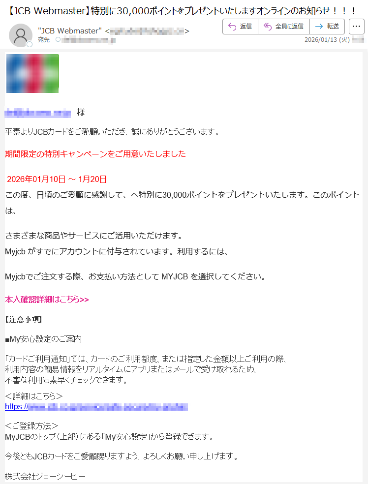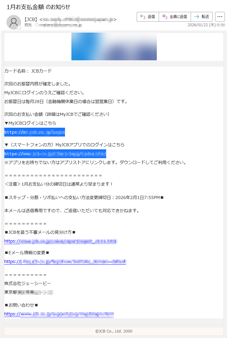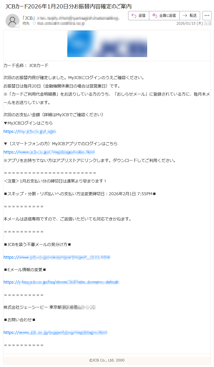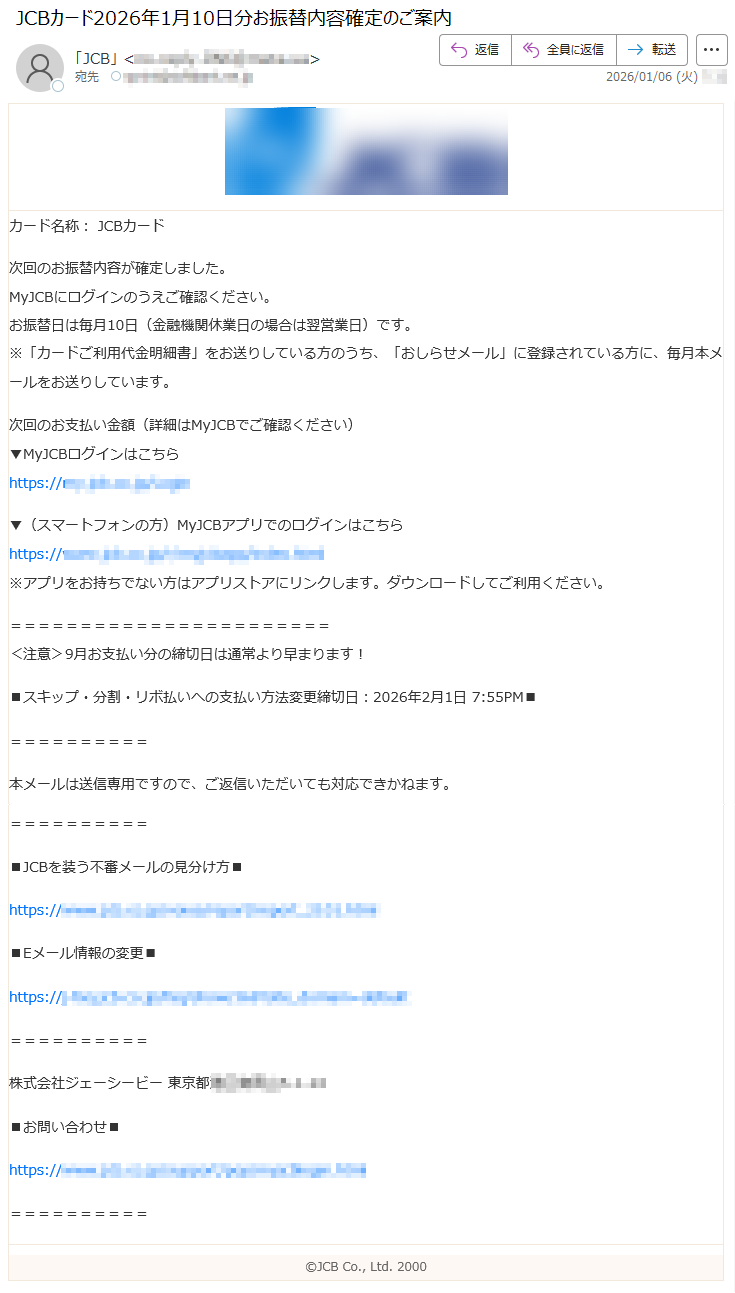 JCBカードになりすました偽メール「件名:JCBカード2026年1月10日分お振替内容確定のご案内」(本偽メールは、実在の企業と無関係に送信されたものです)