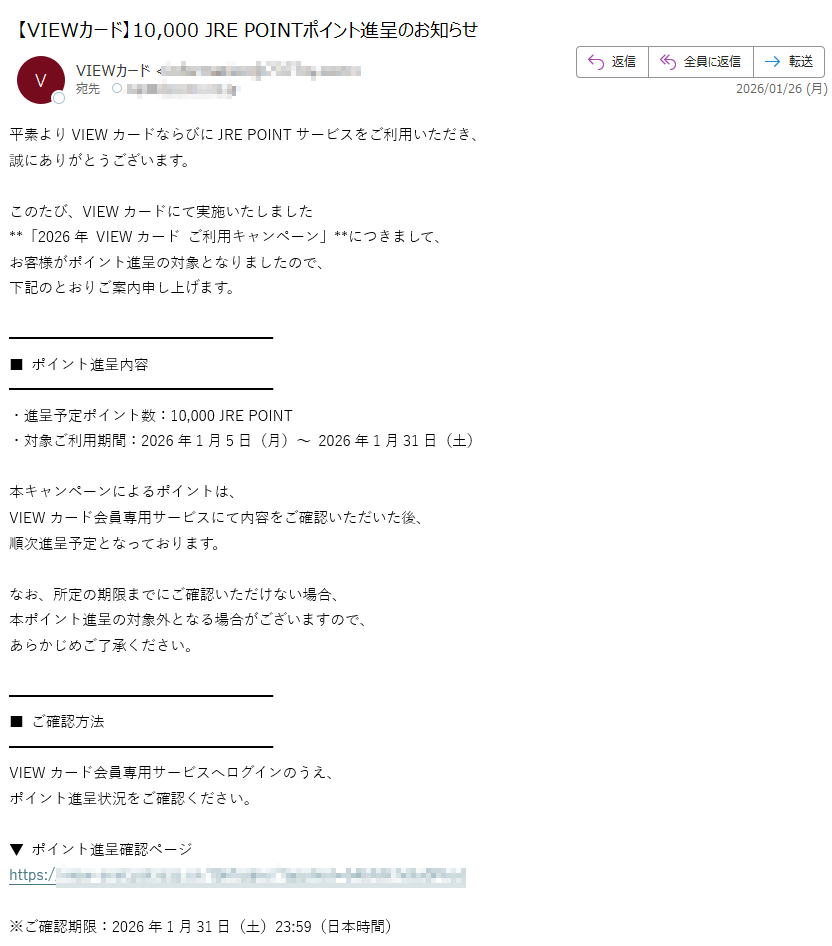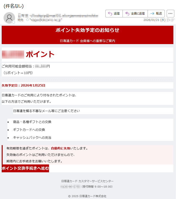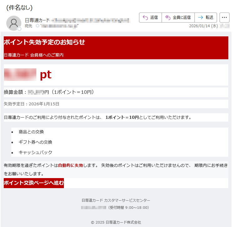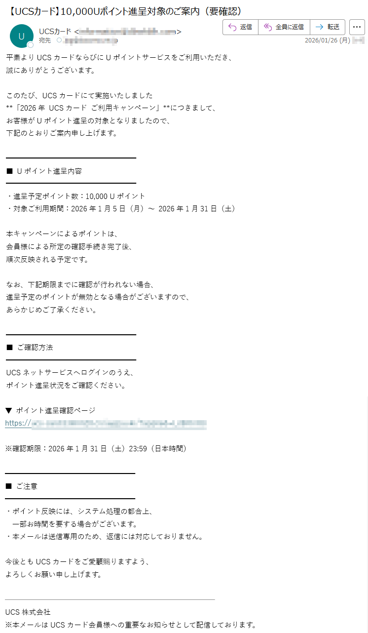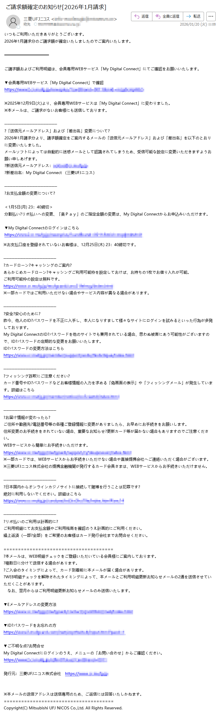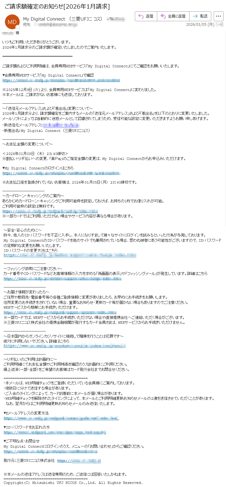 JCBカードになりすました偽メール「件名:JCBカード2026年1月10日分お振替内容確定のご案内」(本偽メールは、実在の企業と無関係に送信されたものです)
