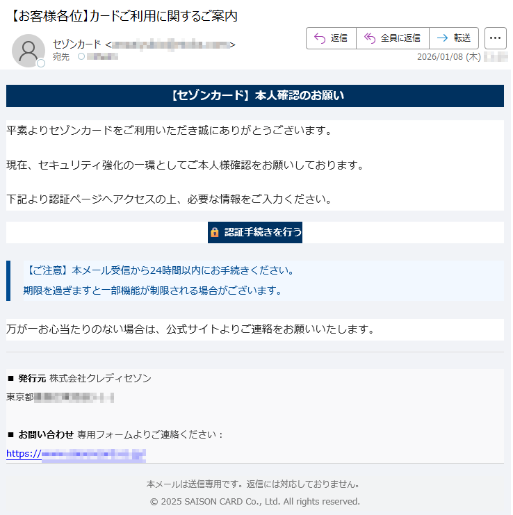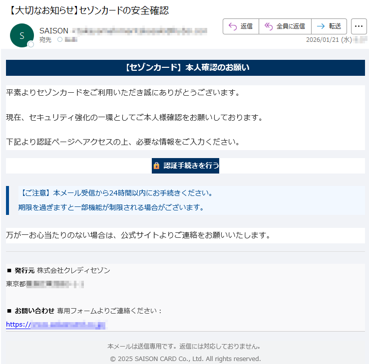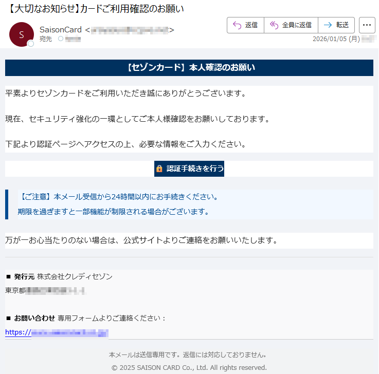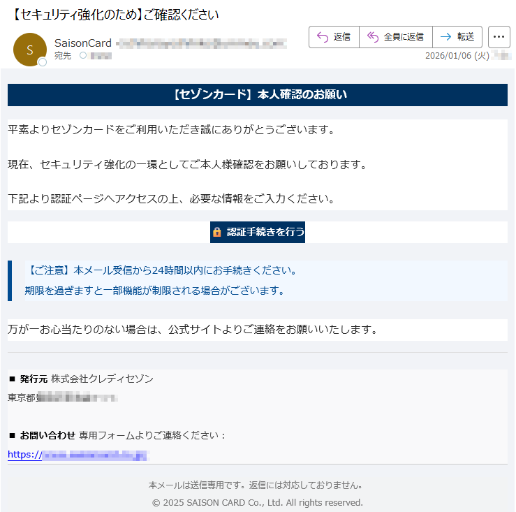 セゾンカードになりすました偽メール「件名:【セキュリティ強化のため】ご確認ください」(本偽メールは、実在の企業と無関係に送信されたものです)