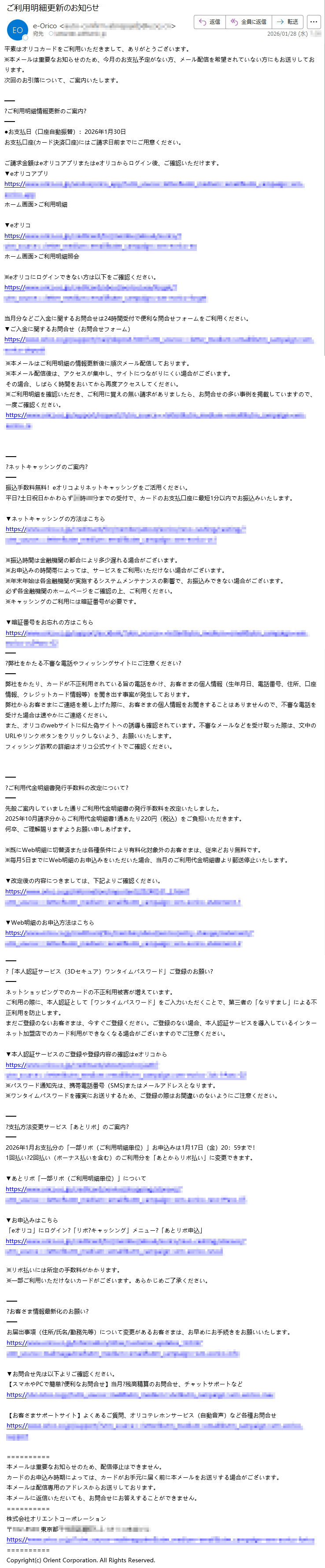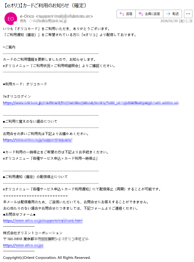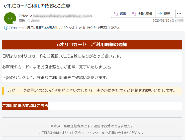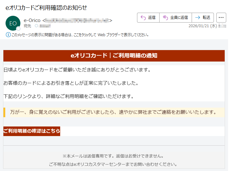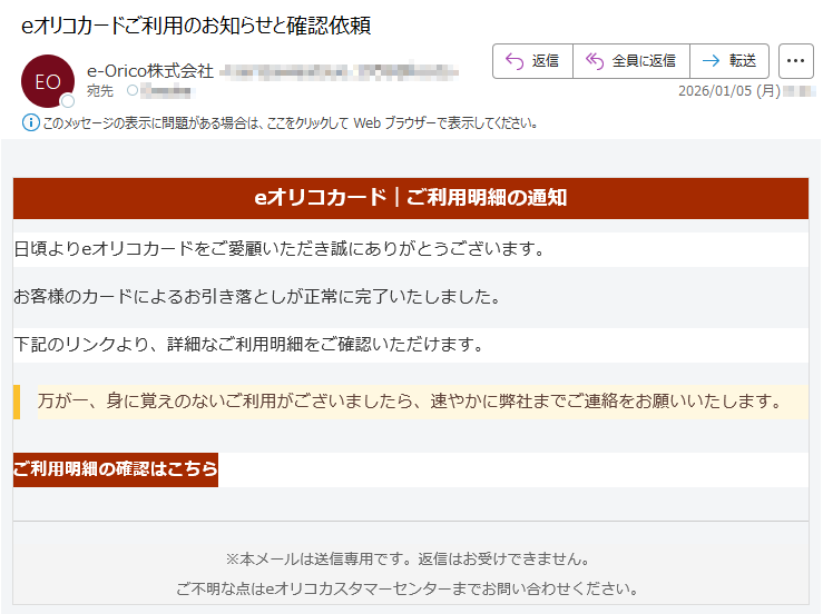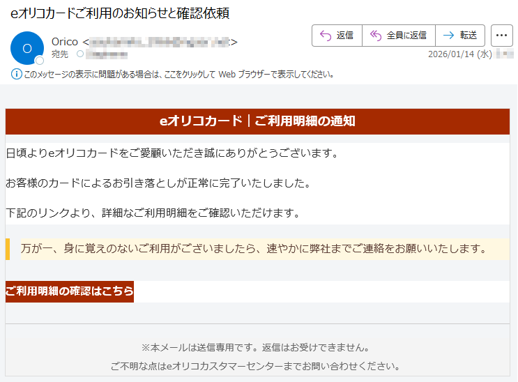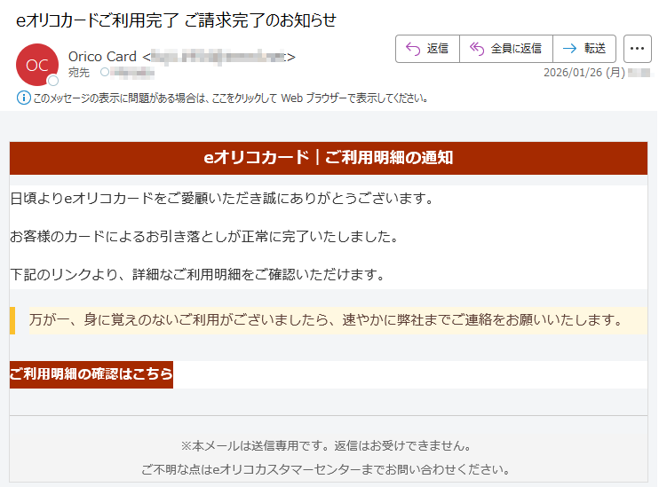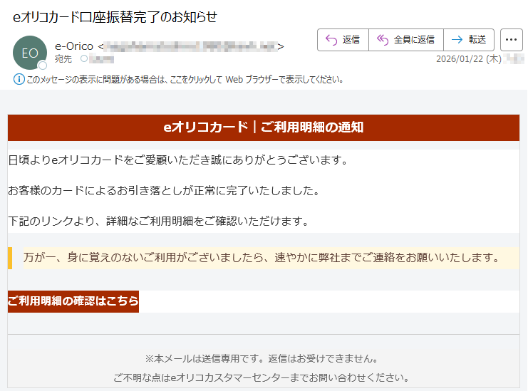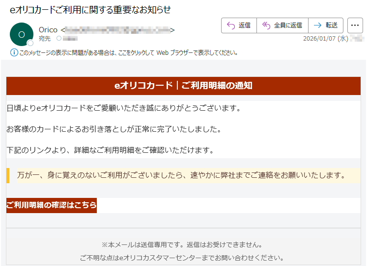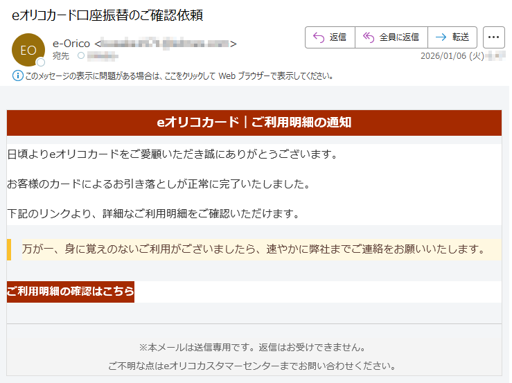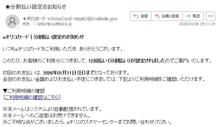 ![eオリコカード|分割払い設定のお知らせいつもeオリコカードをご利用いただき、ありがとうございます。このたび、お客様のご利用分につきまして、12回払い(分割払い)が設定されましたのでご案内いたします。初回のお支払いは、2026年01月11日(日)までとなっております。各回のお支払い金額およびお支払い予定につきましては、下記よりご利用明細をご確認いただけます。▼ご利用明細の確認[ご利用明細の確認はこちら]※本メールはシステムより自動配信されています。※本メールへのご返信はお受けできません。※ご不明な点がございましたら、eオリコカスタマーセンターまでお問い合わせください。](../../../images/alert/2026/1m/nise_mail0108_13.png)