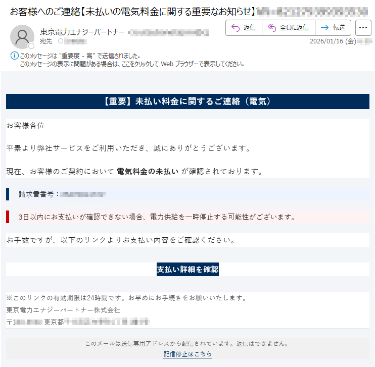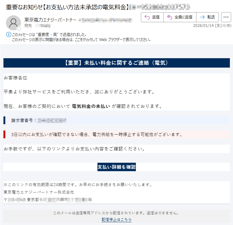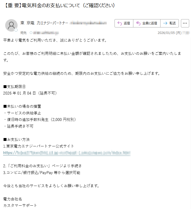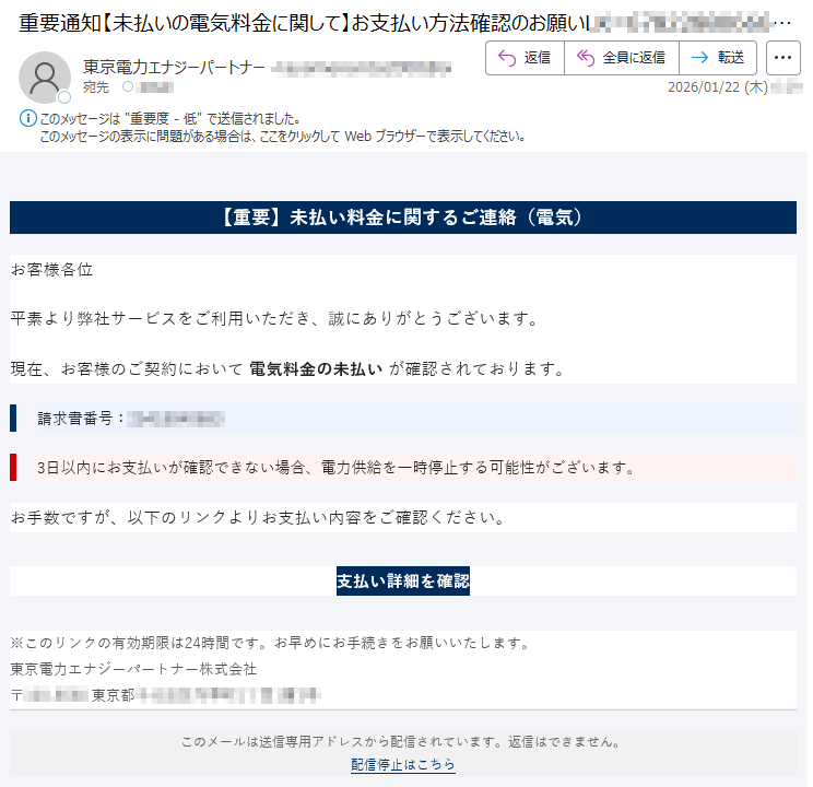 東京電力エナジーパートナーになりすました偽メール「件名:【重 要】電気料金のお支払いについて(ご確認ください)」(本偽メールは、実在の企業と無関係に送信されたものです)