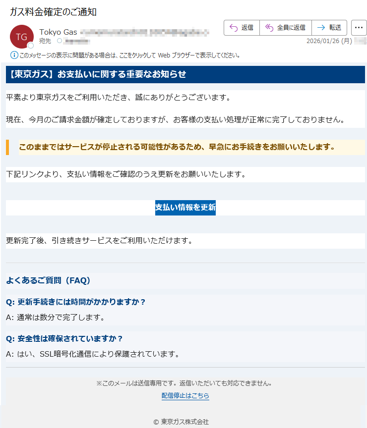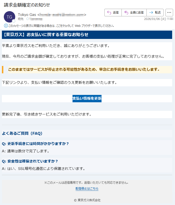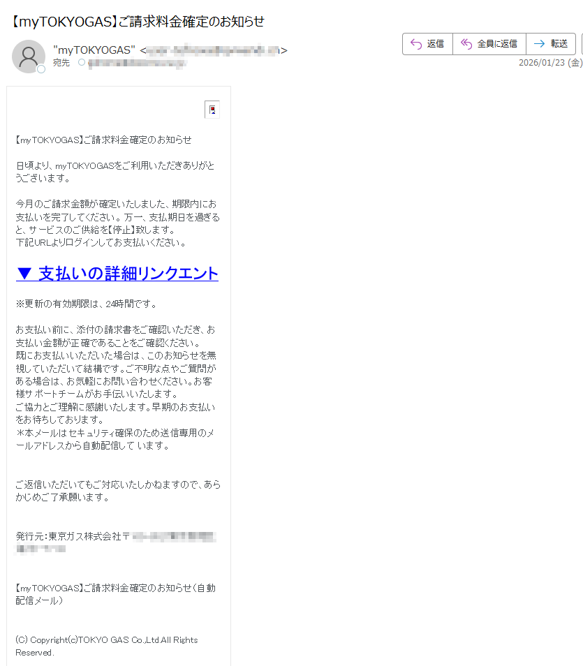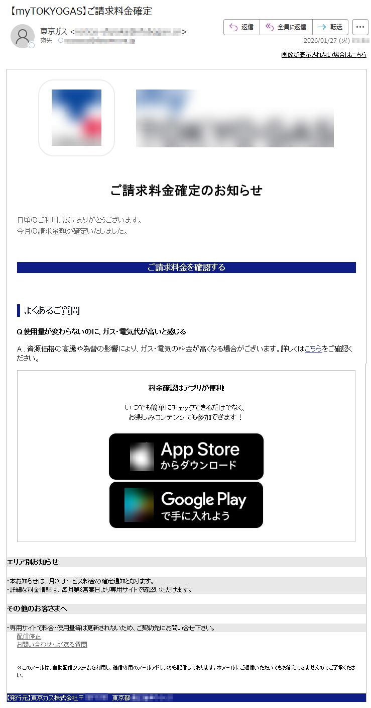東京ガスになりすました偽メール「件名:ガスご利用料金確定のご連絡」(本偽メールは、実在の企業と無関係に送信されたものです)