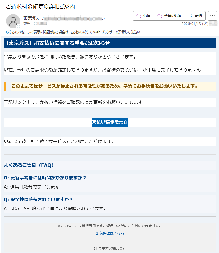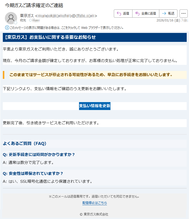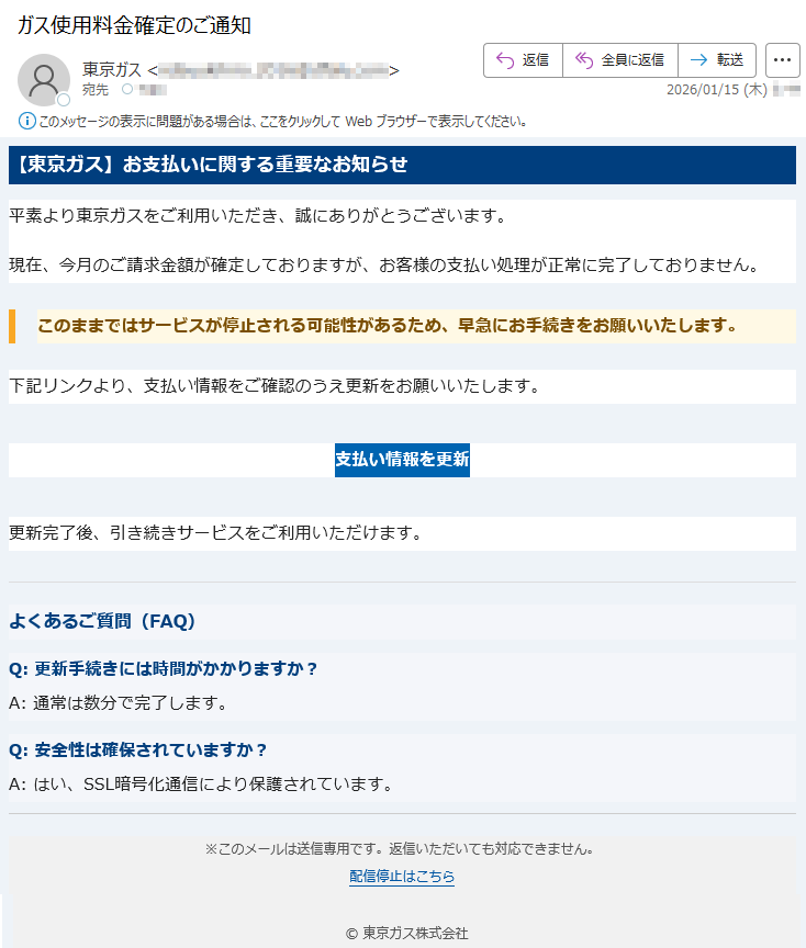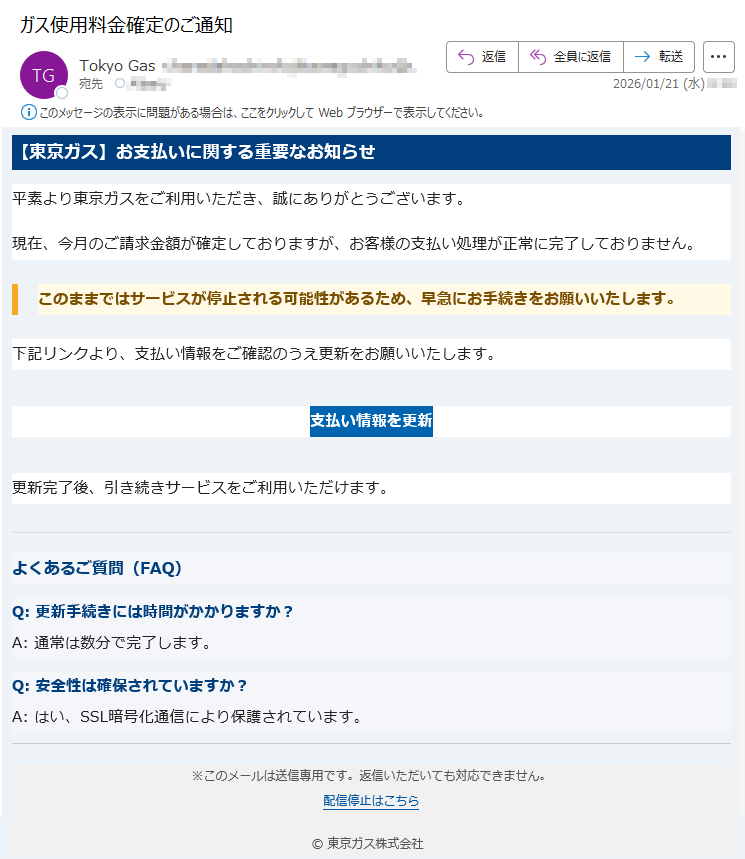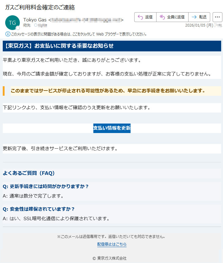 東京ガスになりすました偽メール「件名:ガスご利用料金確定のご連絡」(本偽メールは、実在の企業と無関係に送信されたものです)