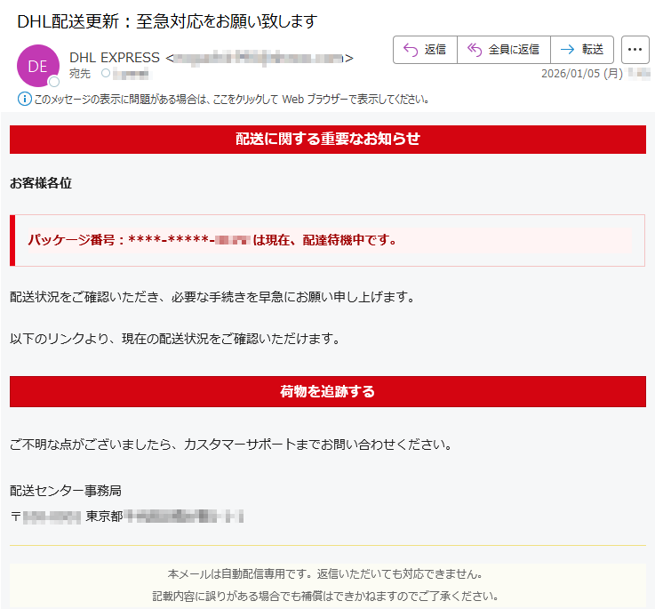 DHLになりすました偽メール「件名:DHL配送更新:至急対応をお願い致します」(本偽メールは、実在の企業と無関係に送信されたものです)