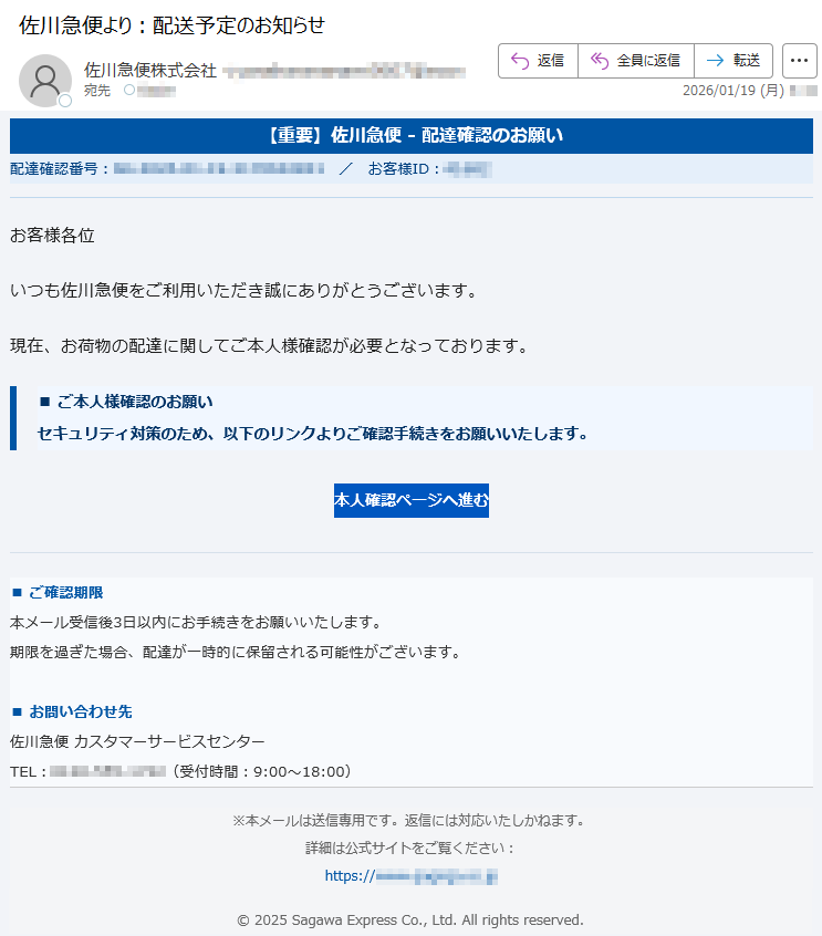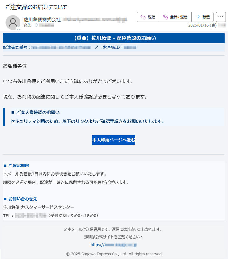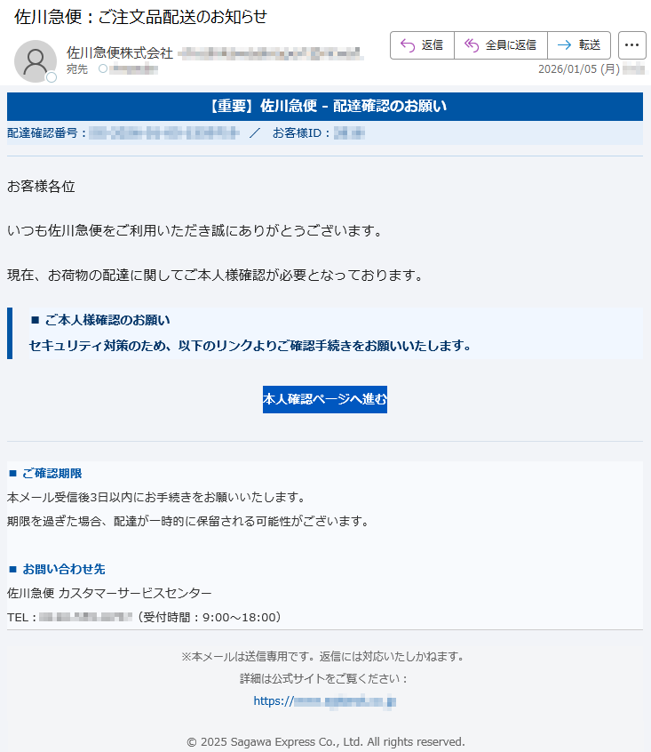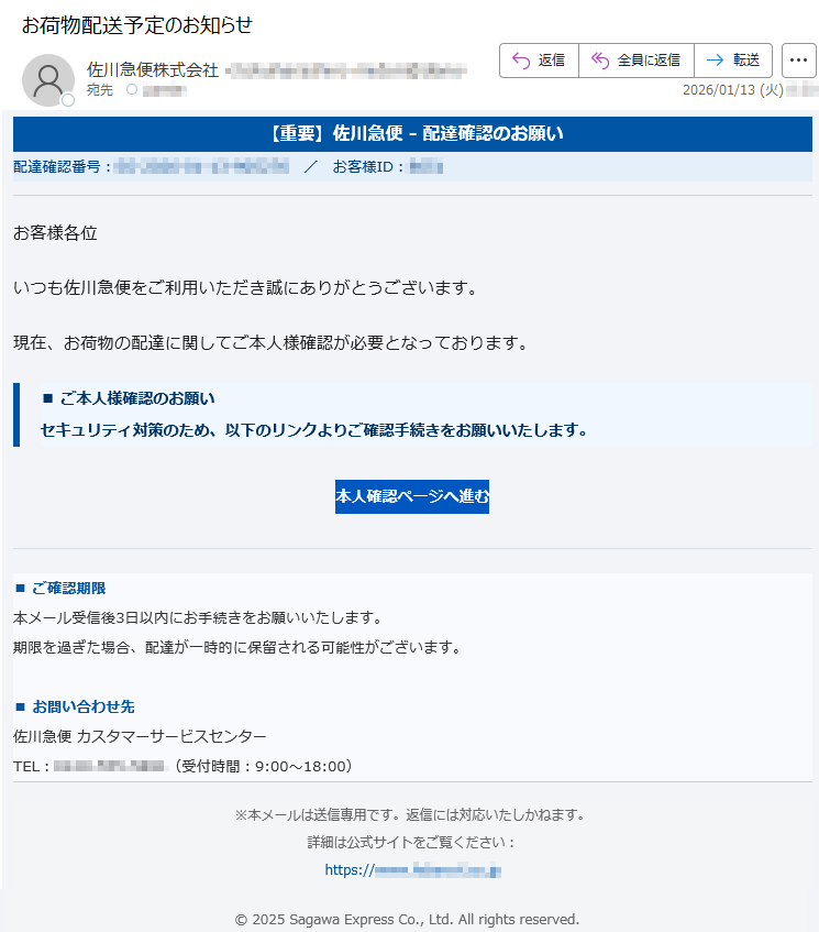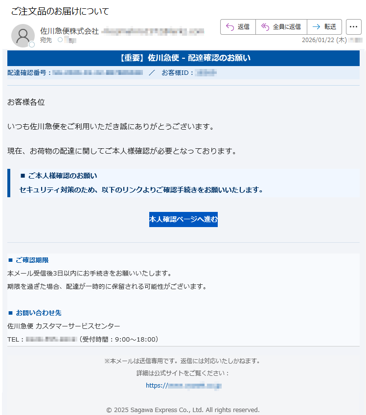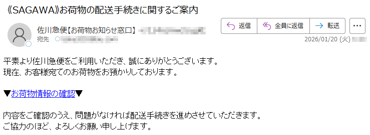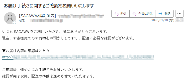 佐川急便になりすました偽メール「件名:お届け手続きに関するご確認をお願いいたします」(本偽メールは、実在の企業と無関係に送信されたものです)