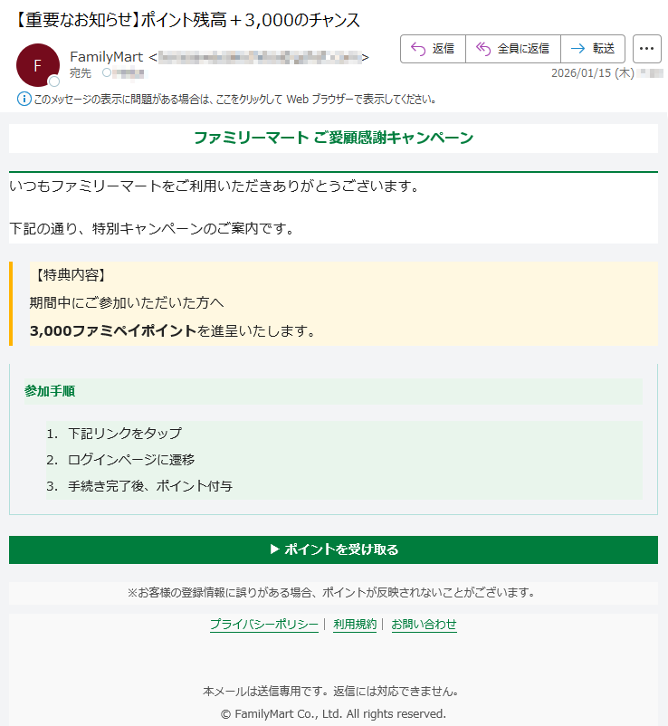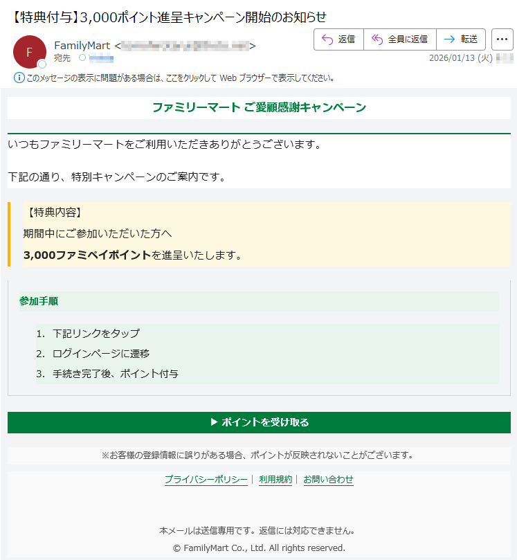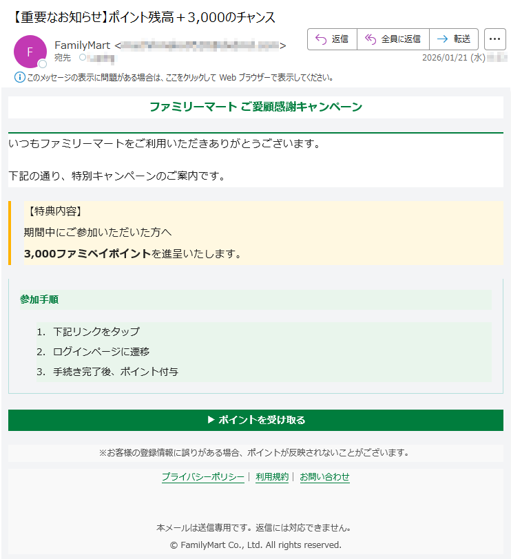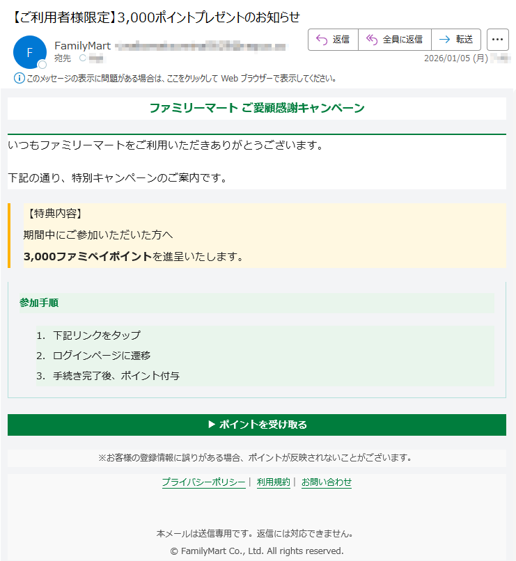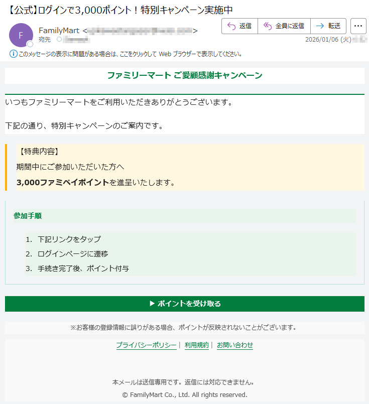 ファミリーマートになりすました偽メール「件名:【公式】ログインで3,000ポイント!特別キャンペーン実施中」(本偽メールは、実在の企業と無関係に送信されたものです)