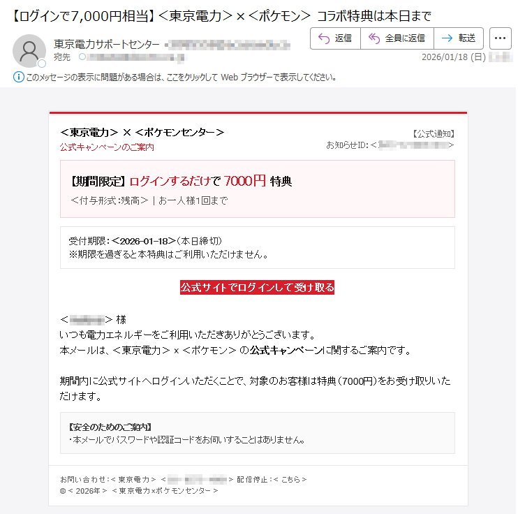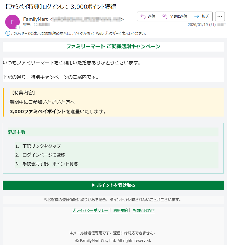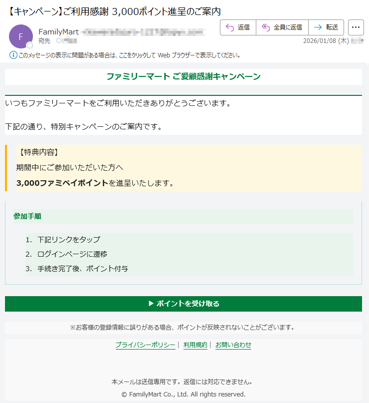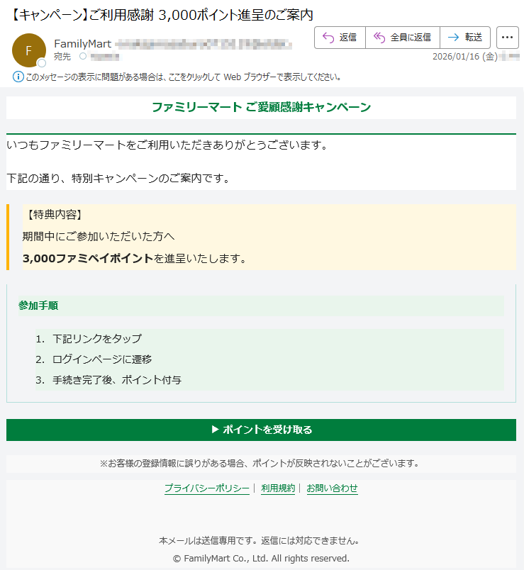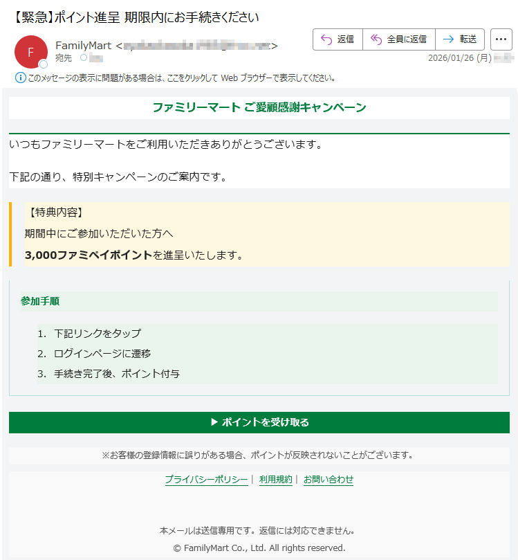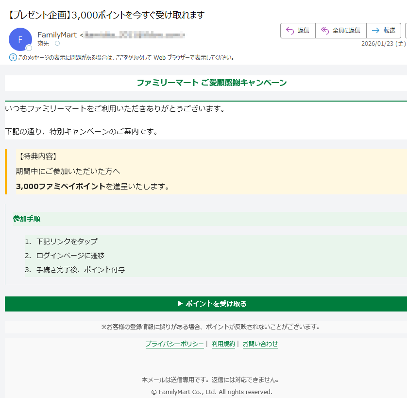 ファミリーマートになりすました偽メール「件名:【公式】ログインで3,000ポイント!特別キャンペーン実施中」(本偽メールは、実在の企業と無関係に送信されたものです)