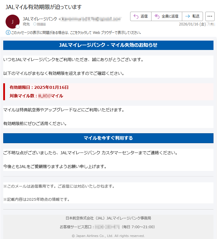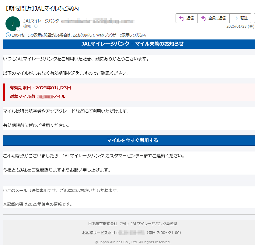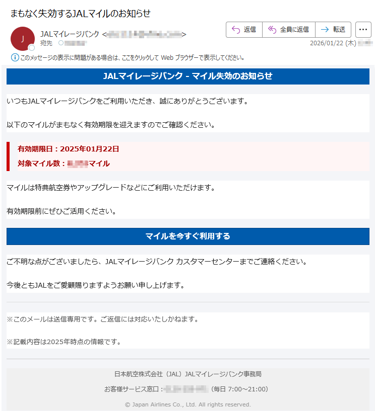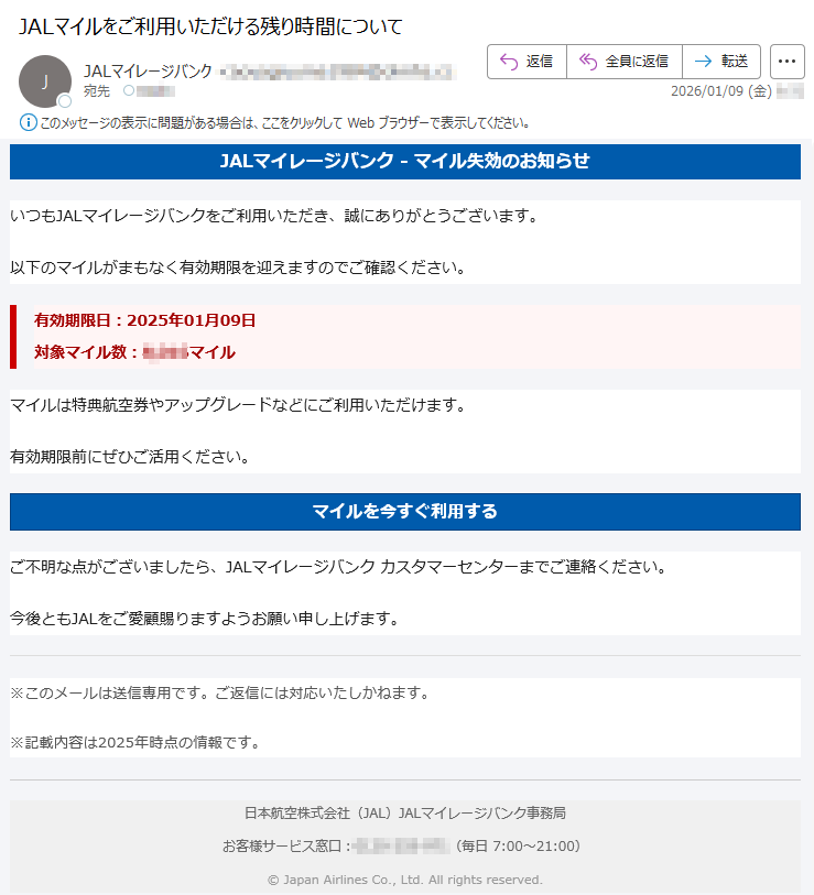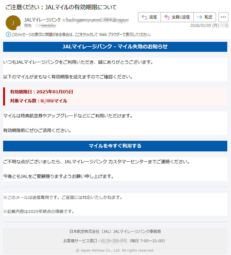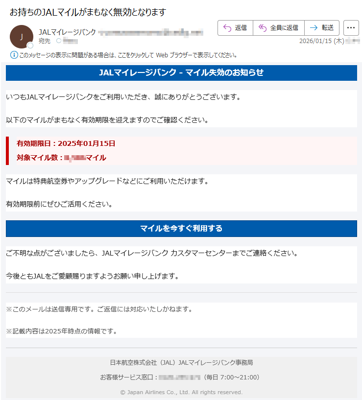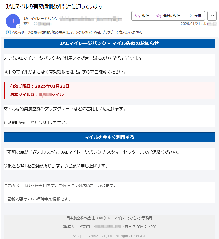 JALマイレージバンクになりすました偽メール「件名:ご注意ください:JALマイルの有効期限について」(本偽メールは、実在の企業と無関係に送信されたものです)