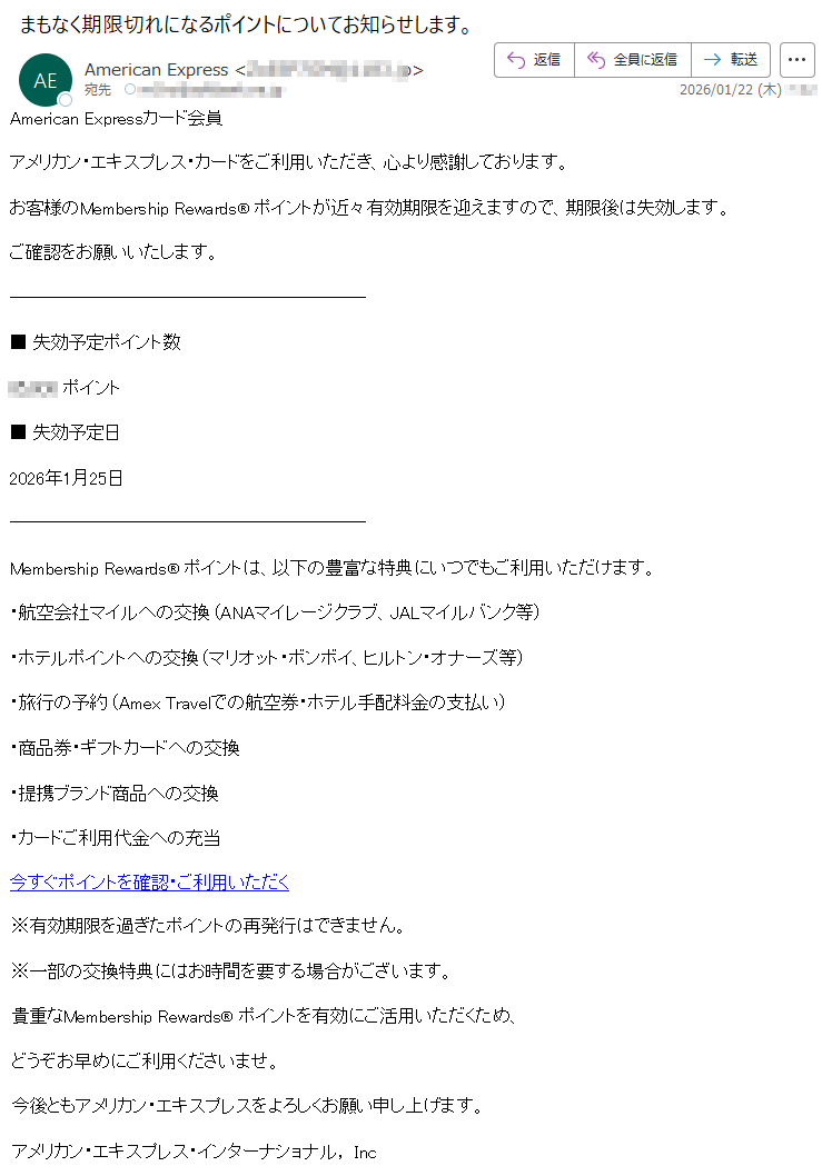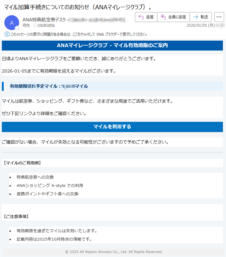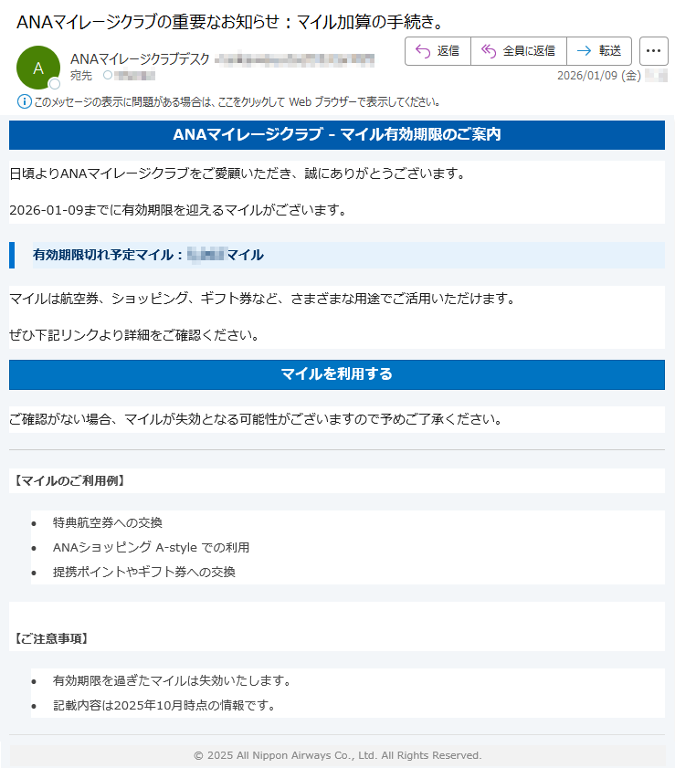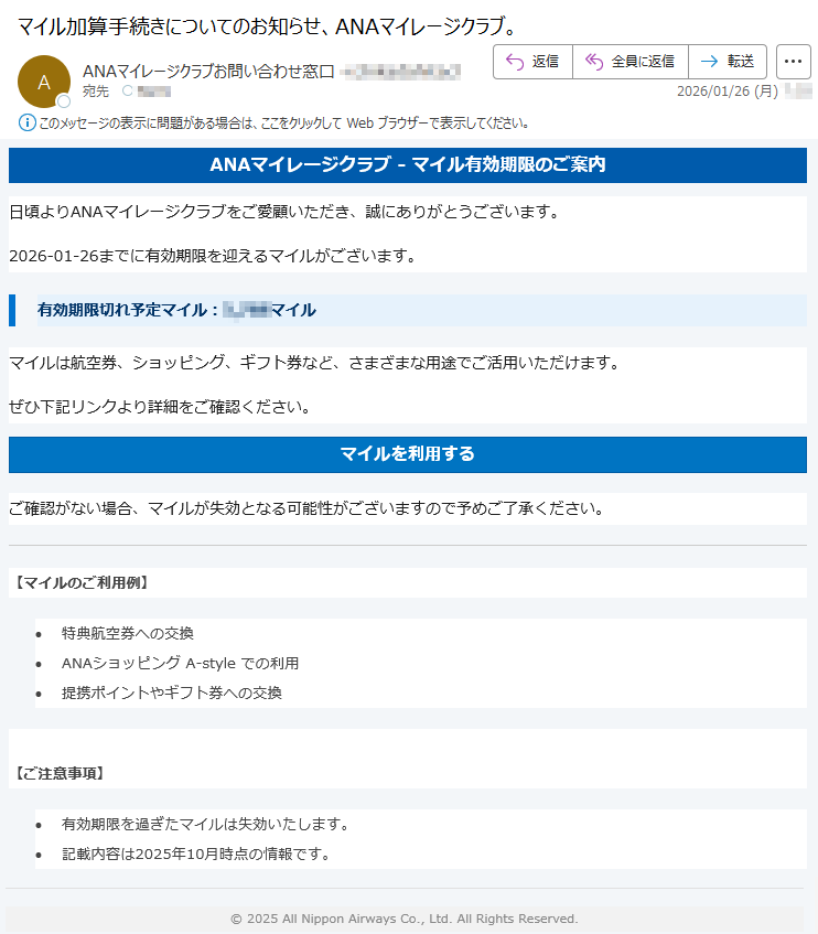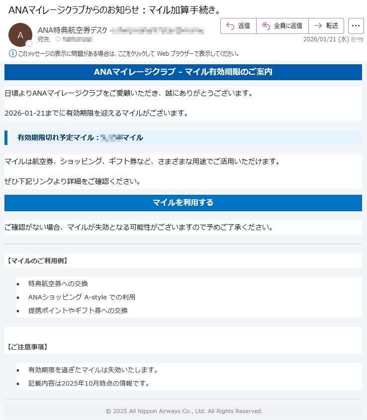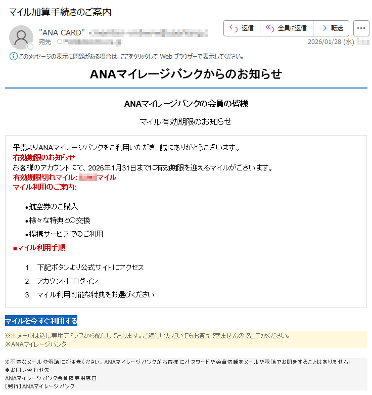![ANAマイレージバンクからのお知らせANAマイレージバンクの会員の皆様マイル有効期限のお知らせ平素よりANAマイレージバンクをご利用いただき、誠にありがとうございます。有効期限のお知らせお客様のアカウントにて、2026年1月31日までに有効期限を迎えるマイルがございます。有効期限切れマイル:*****マイルマイル利用のご案内:•航空券のご購入•様々な特典との交換•提携サービスでのご利用■マイル利用手順1.下記ボタンより公式サイトにアクセス2.アカウントにログイン3.マイル利用可能な特典をお選びくださいマイルを今すぐ利用する※本メールは送信専用アドレスから配信しております。ご返信いただいてもお答えできませんのでご了承ください。※ANAマイレージバンク※不審なメールや電話にご注意ください。ANAマイレージバンクがお客様にパスワードや会員情報をメールや電話でお聞きすることはありません。◆お問い合わせ先ANAマイレージバンク会員様専用窓口[発行]ANAマイレージバンク](../../../images/alert/2026/1m/nise_mail0128_10.png)