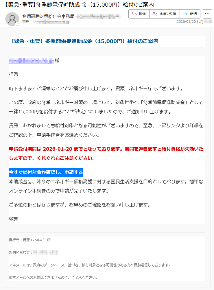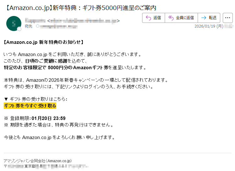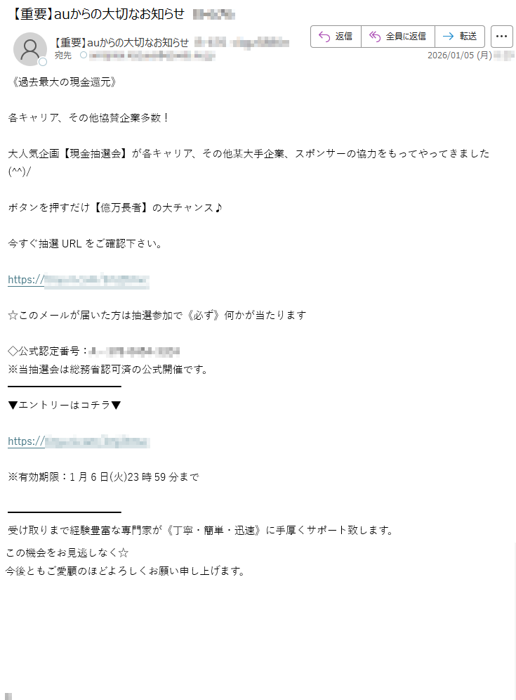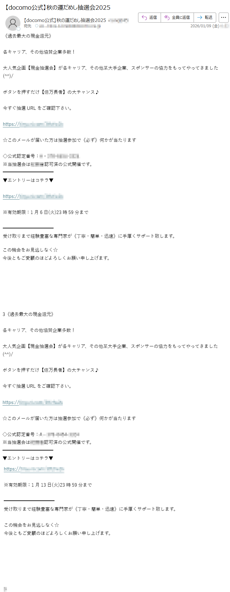 2026年1月5日現在、以下の迷惑メール・詐欺メールが送信されているので気をつけてください。