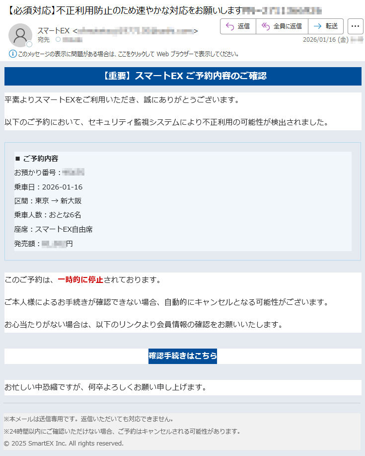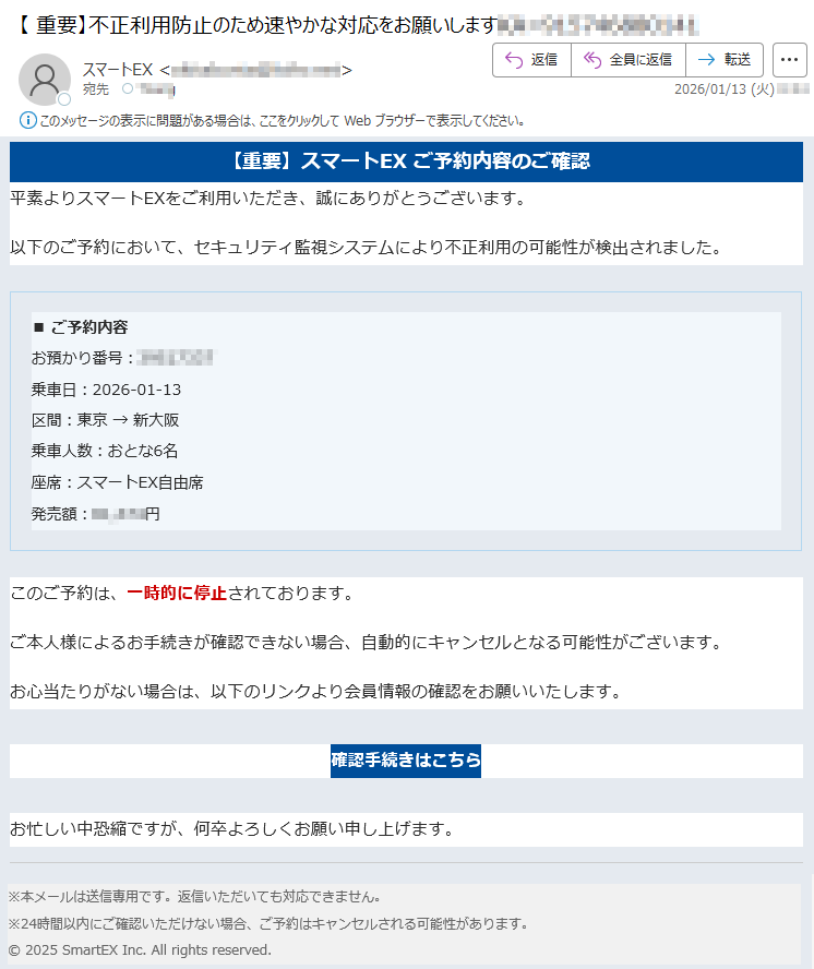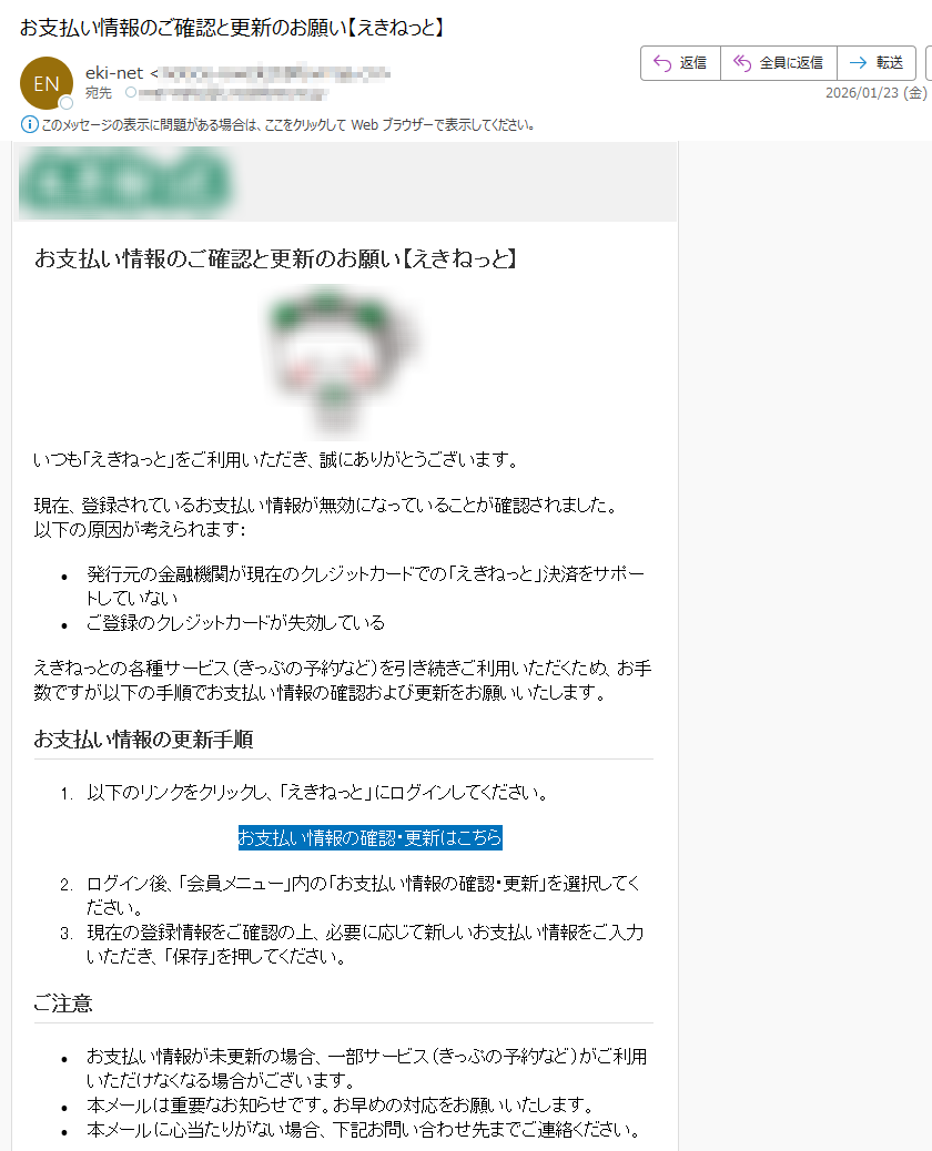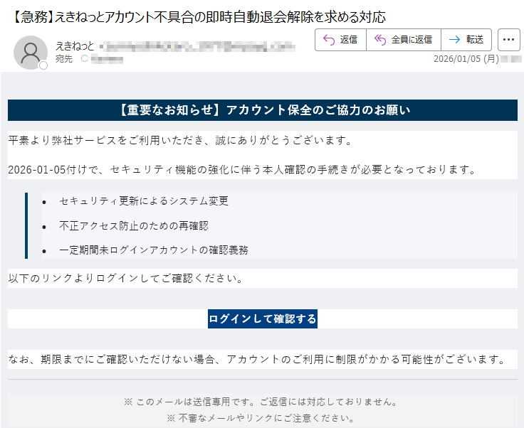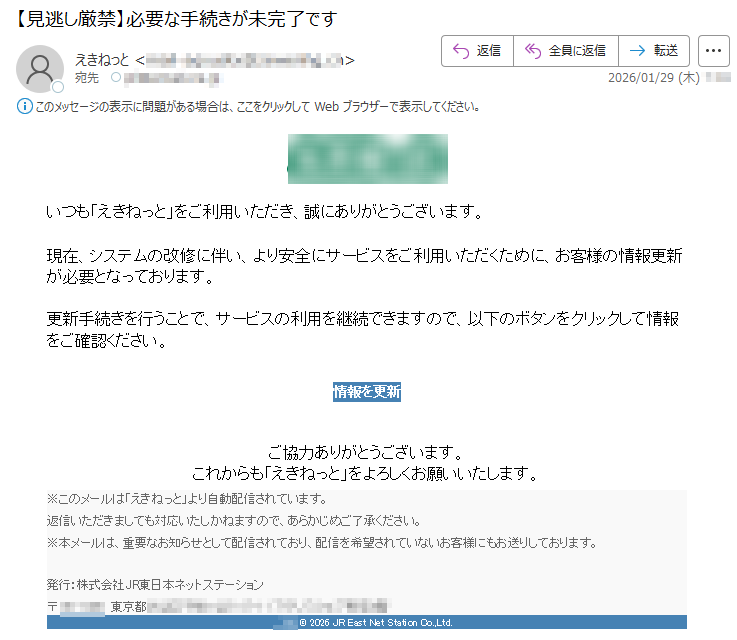 えきねっとになりすました偽メール「件名:【見逃し厳禁】必要な手続きが未完了です」(本偽メールは、実在の企業と無関係に送信されたものです)