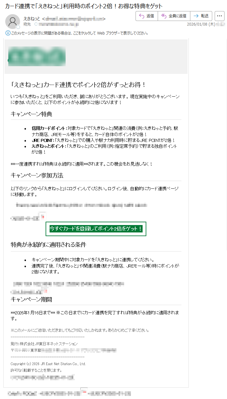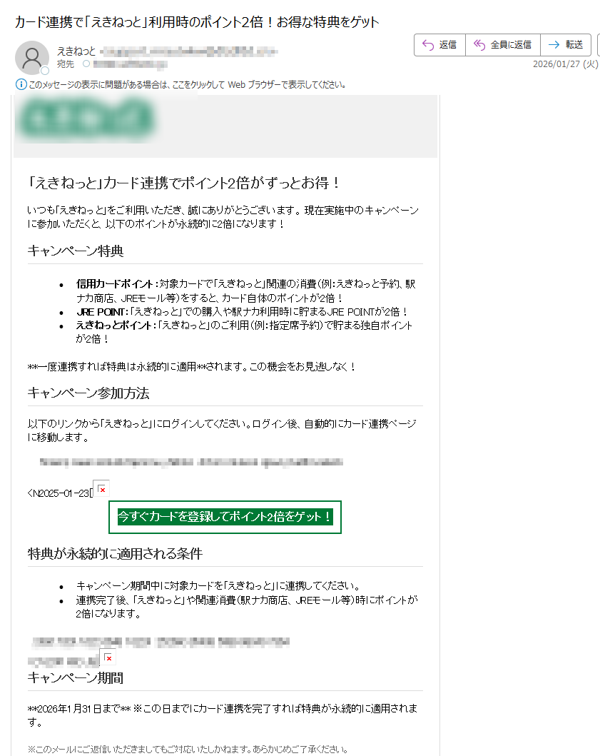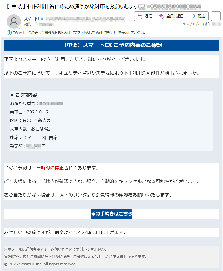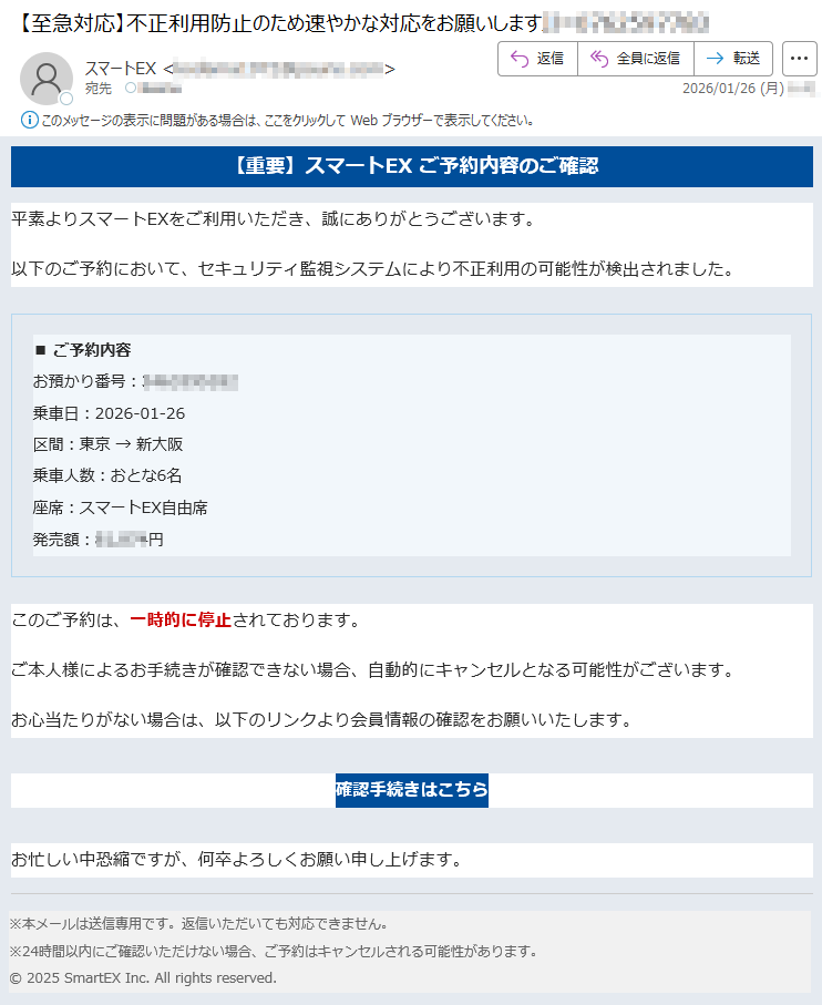 えきねっとになりすました偽メール「件名:【見逃し厳禁】必要な手続きが未完了です」(本偽メールは、実在の企業と無関係に送信されたものです)