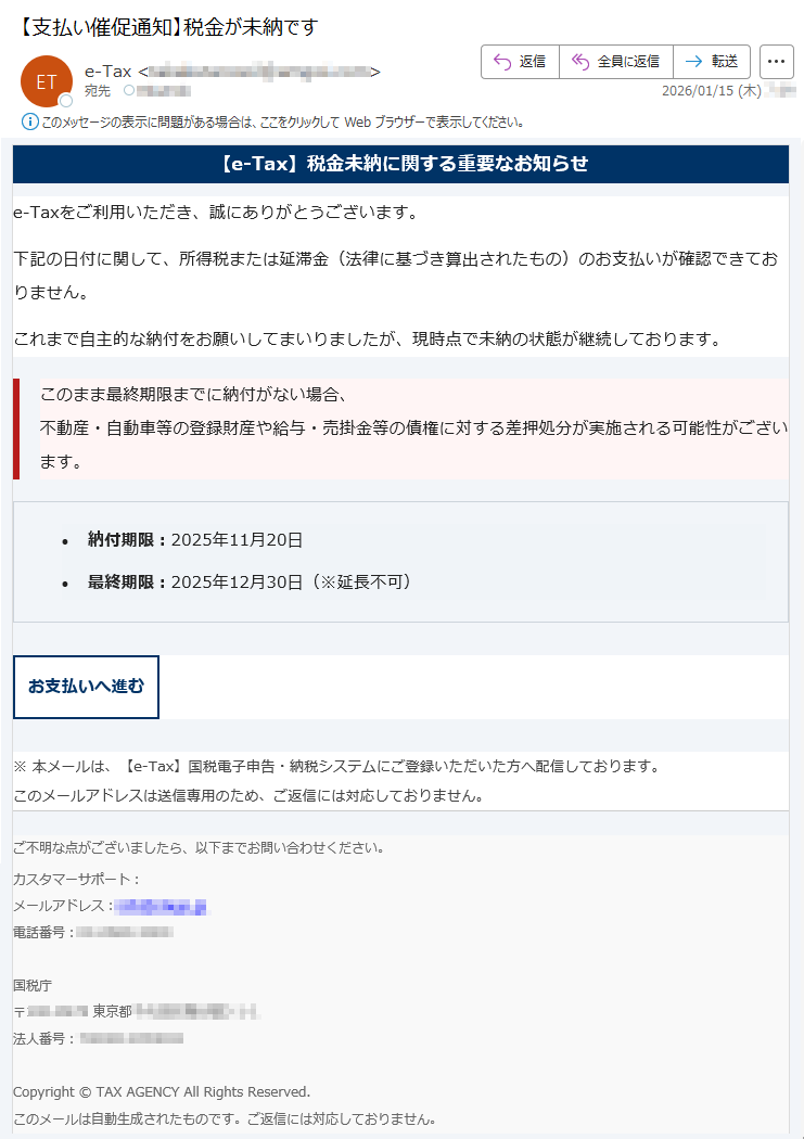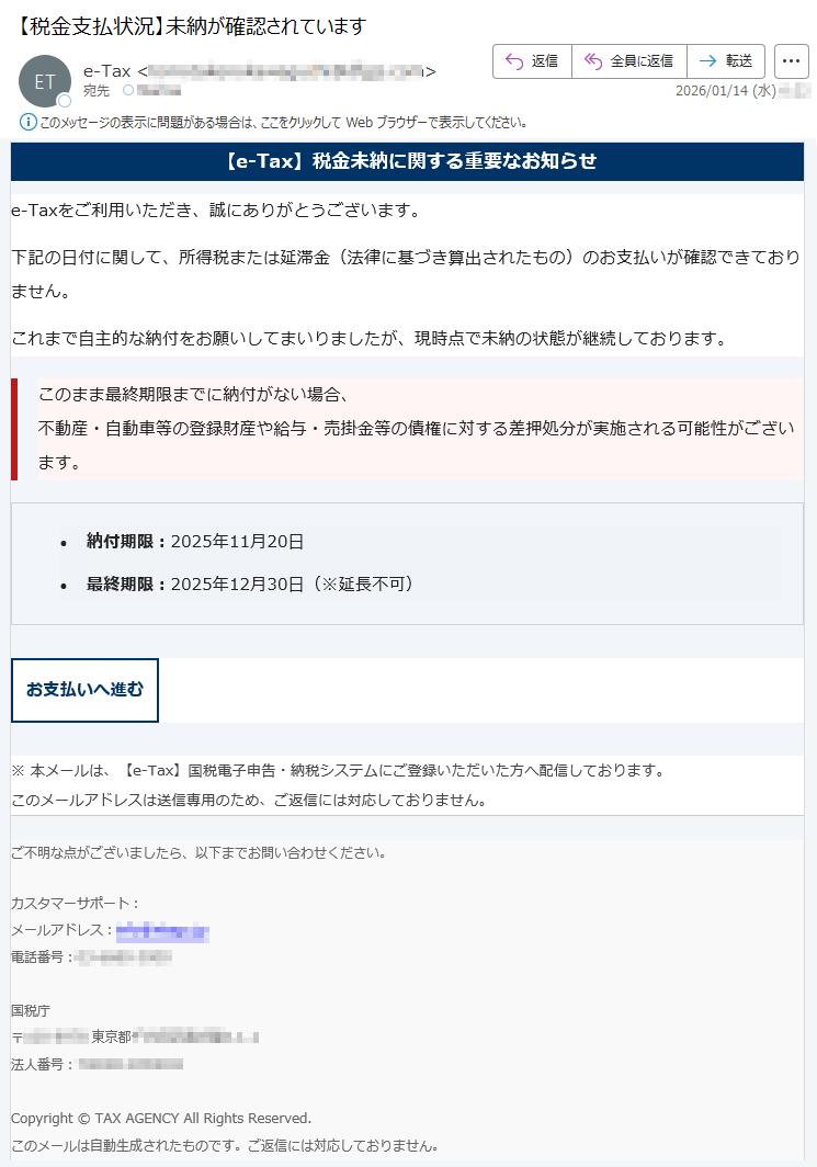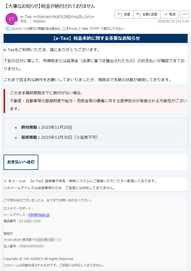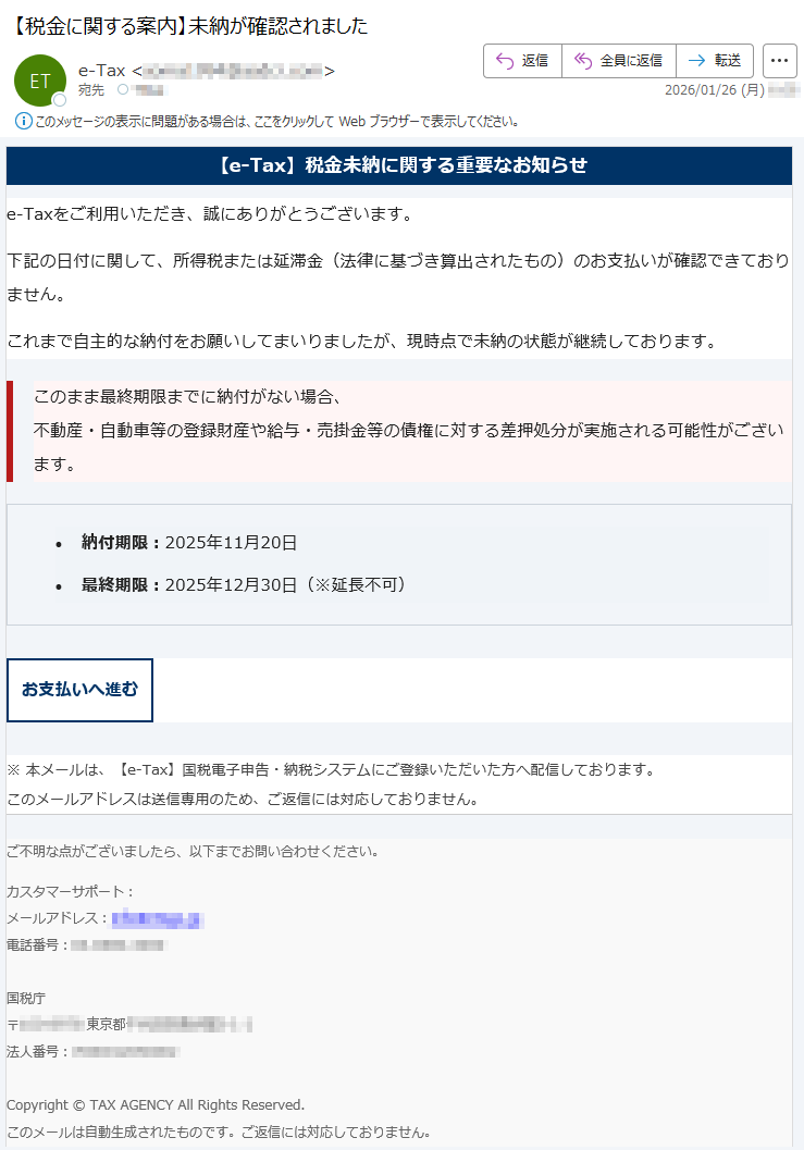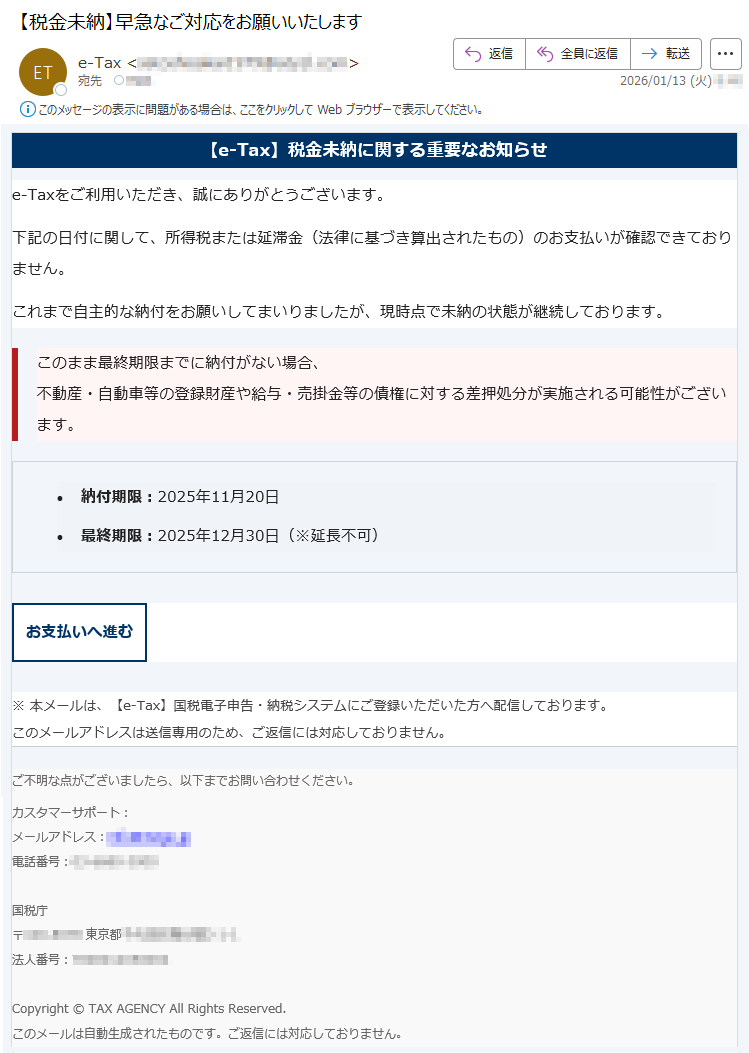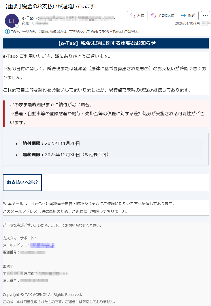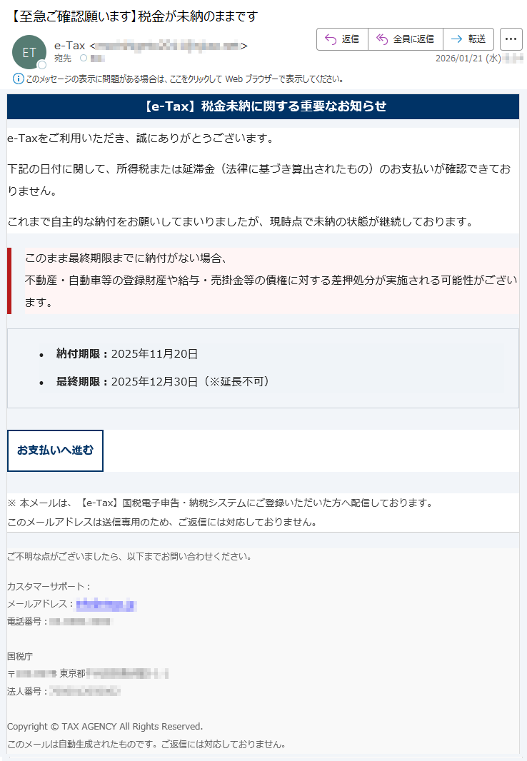国税庁になりすました偽メール「件名:【重要】税金のお支払いが遅延しています」(本偽メールは、実在の企業と無関係に送信されたものです)
