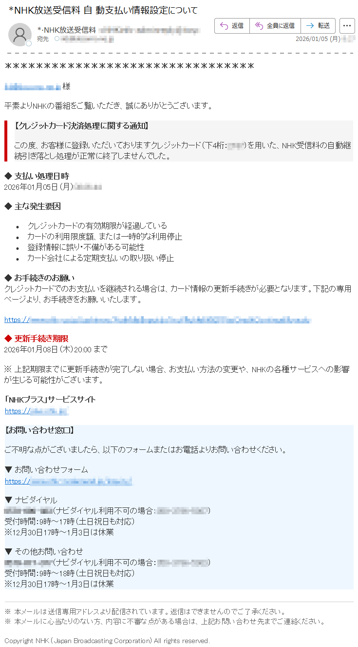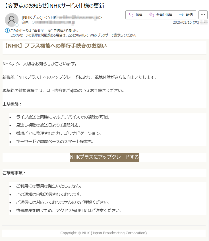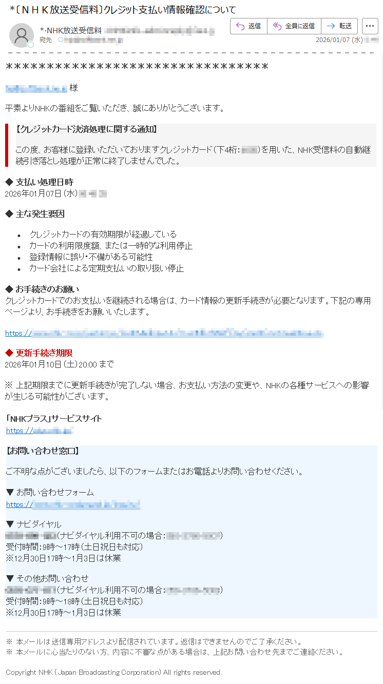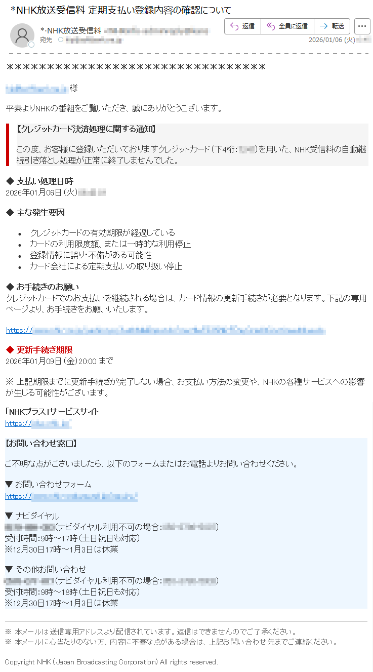 NHKになりすました偽メール「件名:*NHK放送受信料 定期支払い登録内容の確認について」(本偽メールは、実在の企業と無関係に送信されたものです)