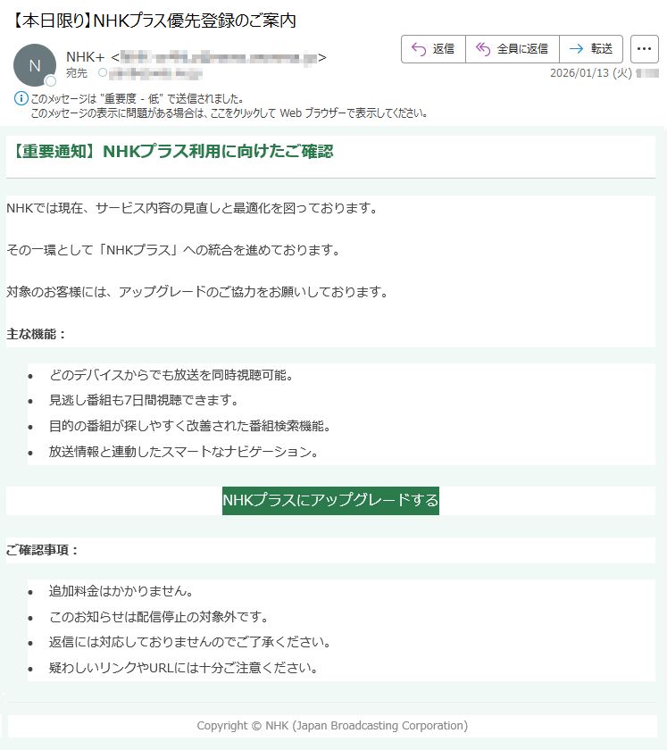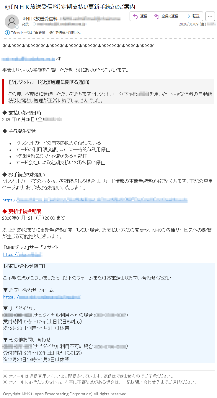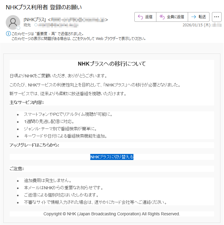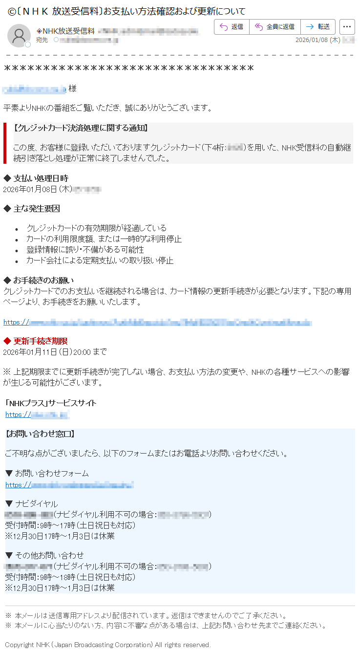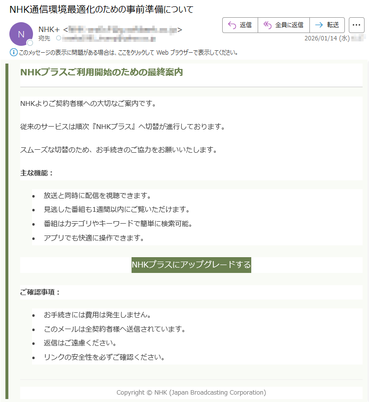 NHKになりすました偽メール「件名:*NHK放送受信料 定期支払い登録内容の確認について」(本偽メールは、実在の企業と無関係に送信されたものです)