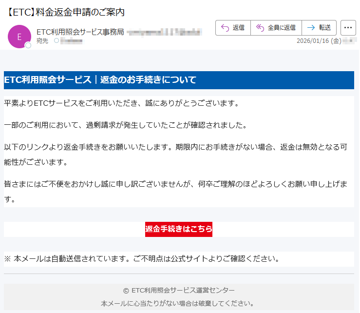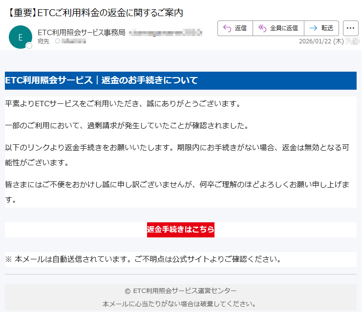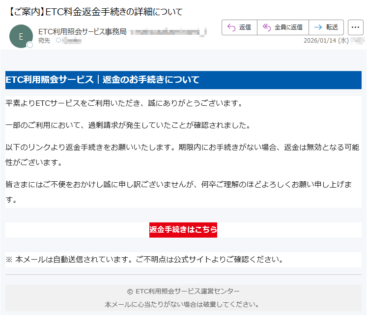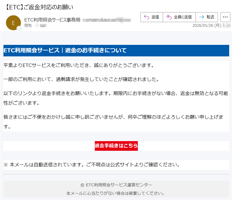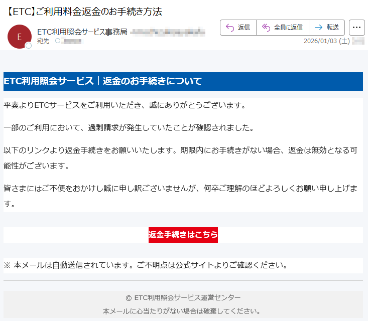 ETC利用照会サービスになりすました偽メール「件名:【ETC】ご利用料金返金のお手続き方法」(本偽メールは、実在の企業と無関係に送信されたものです)