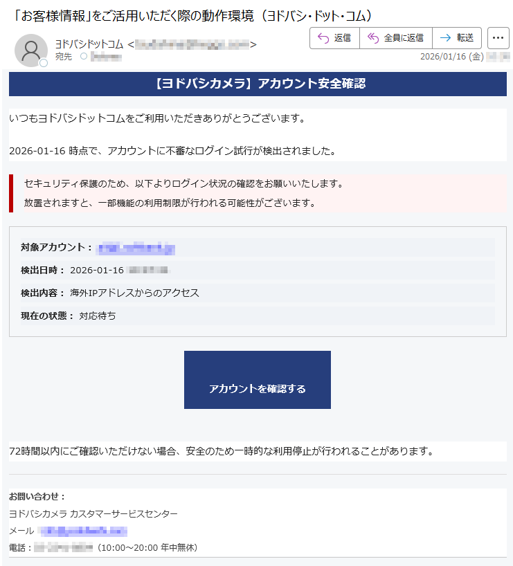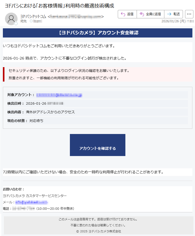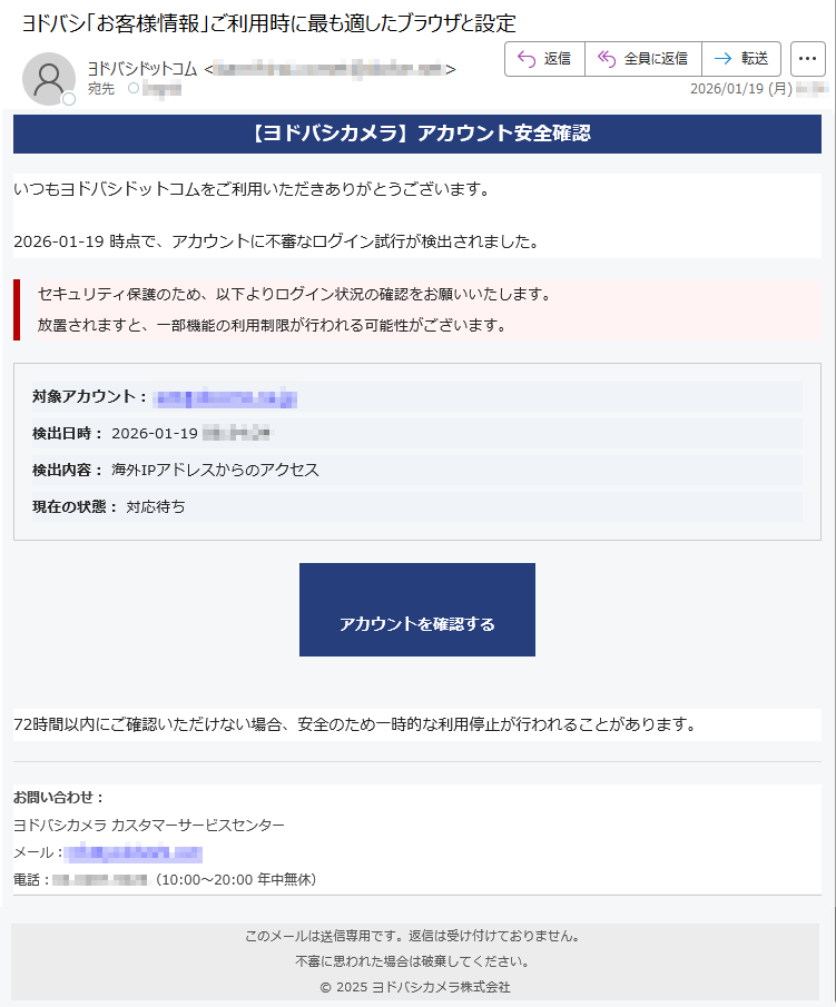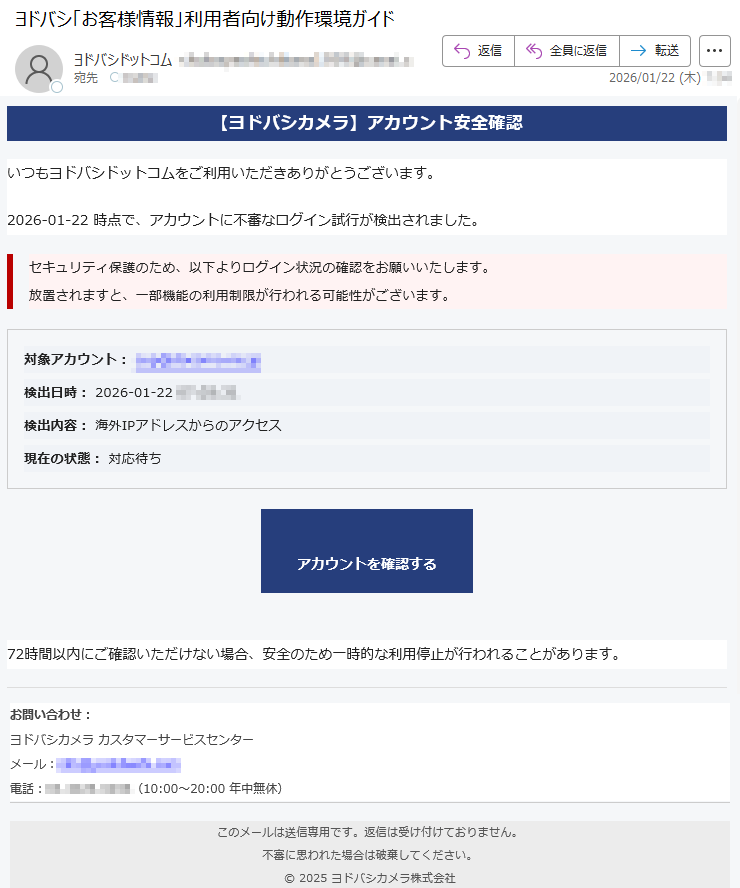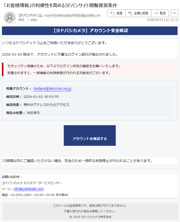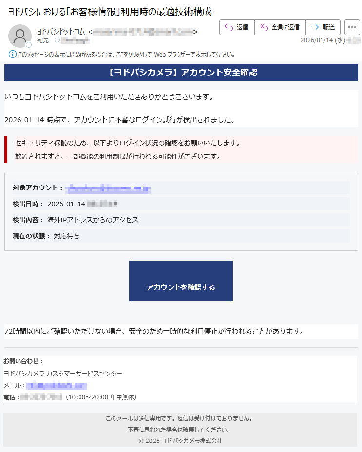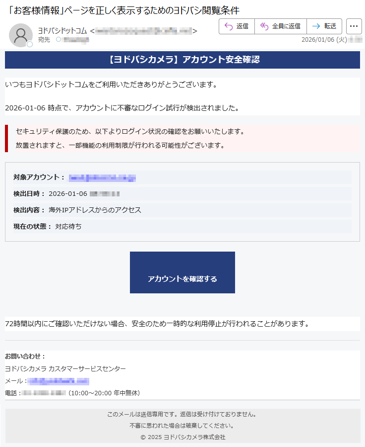 ヨドバシカメラになりすました偽メール「件名:「お客様情報」の利便性を高めるヨドバシサイト閲覧推奨条件」(本偽メールは、実在の企業と無関係に送信されたものです)