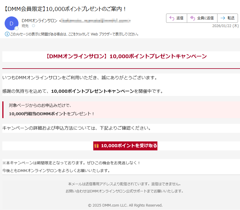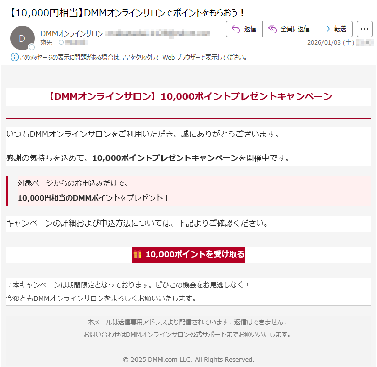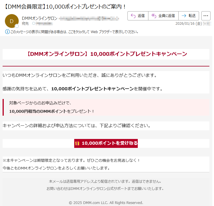 DMMオンラインサロンになりすました偽メール「件名:【10,000円相当】DMMオンラインサロンでポイントをもらおう!」(本偽メールは、実在の企業と無関係に送信されたものです)
