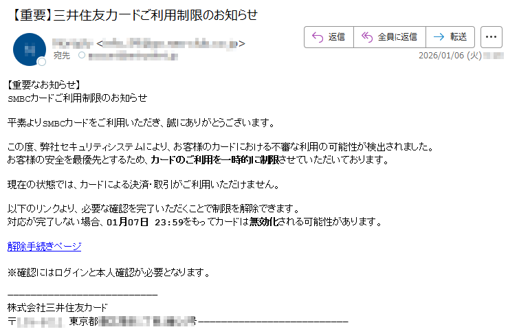 三井住友カードになりすました偽メール「件名:【重要】三井住友力一ドご利用制限のお知らせ」(本偽メールは、実在の企業と無関係に送信されたものです)