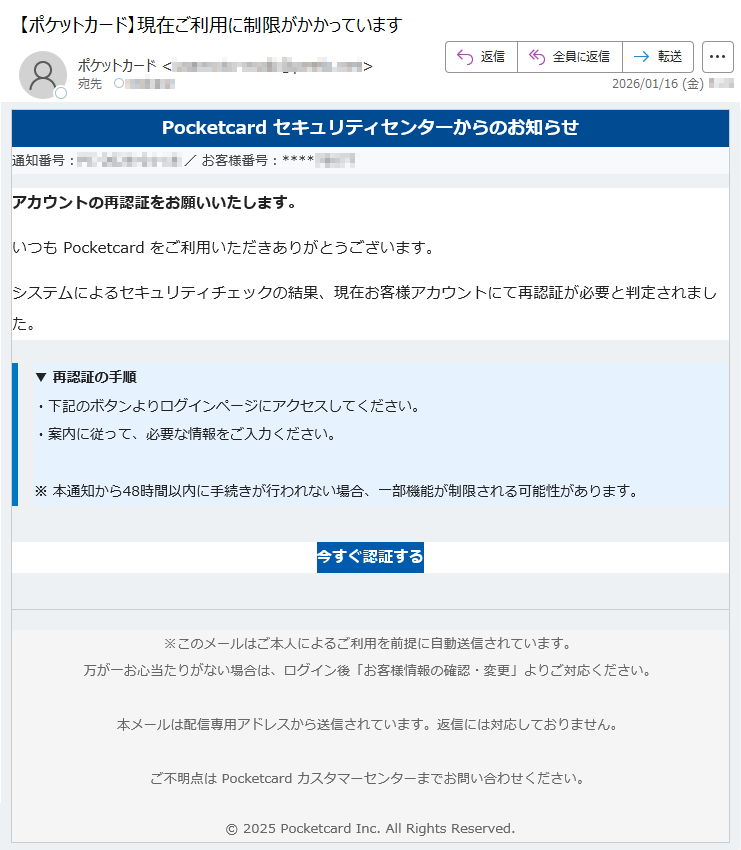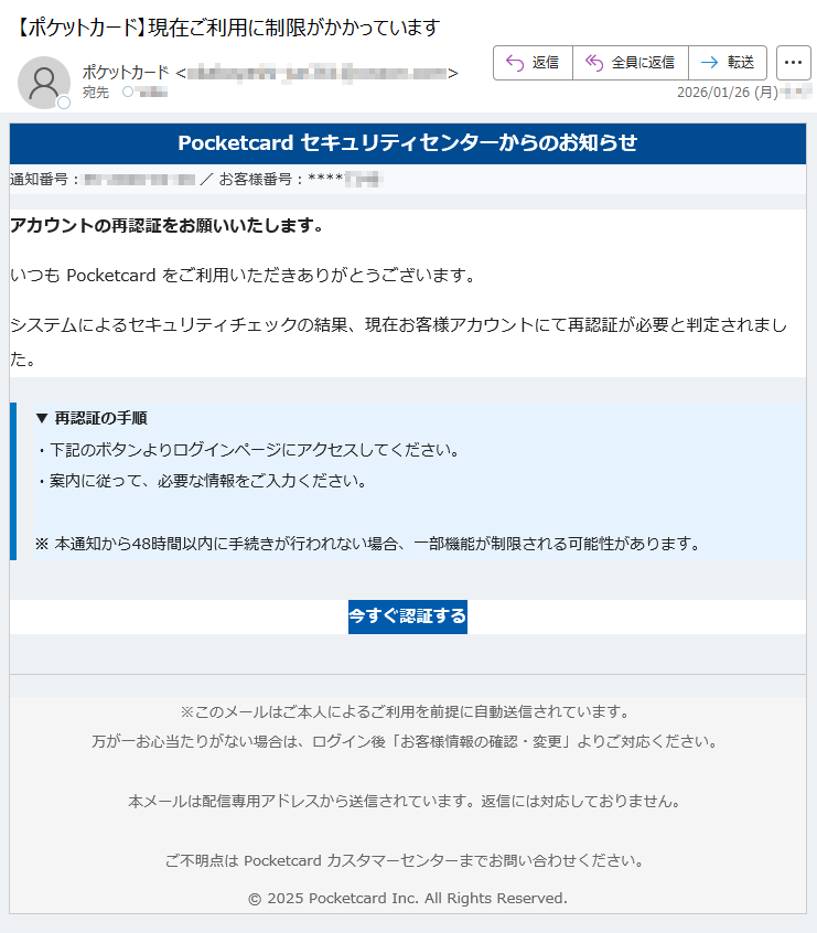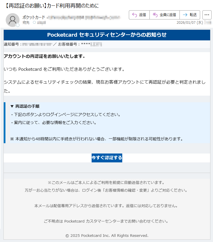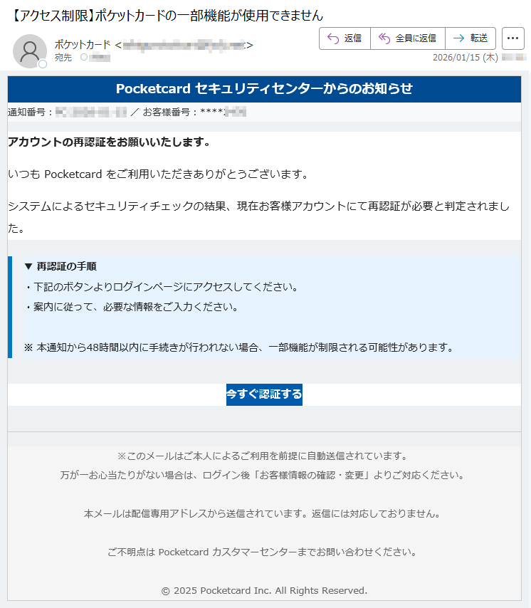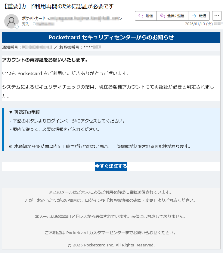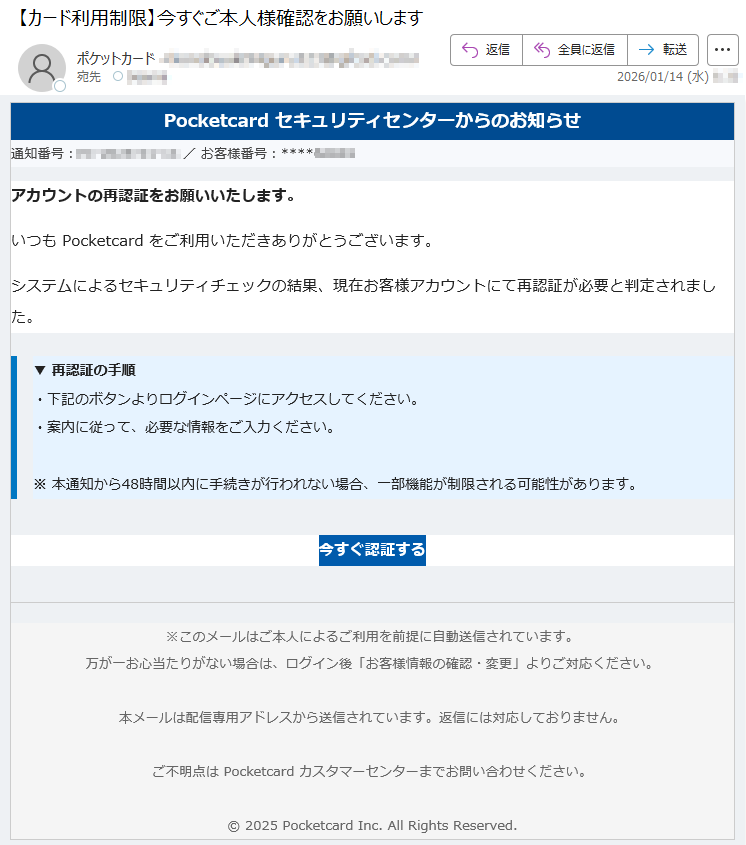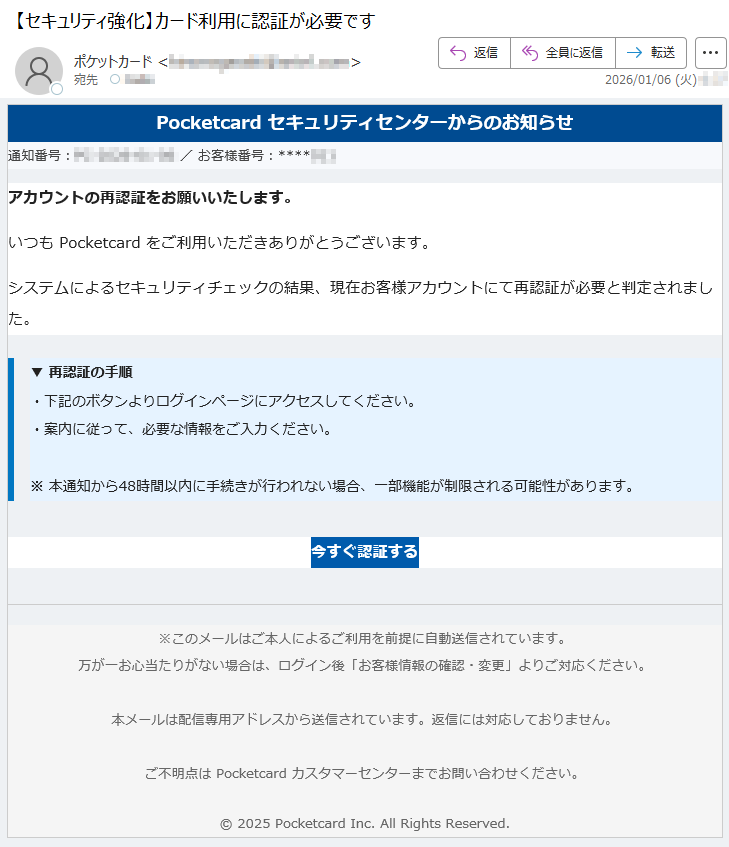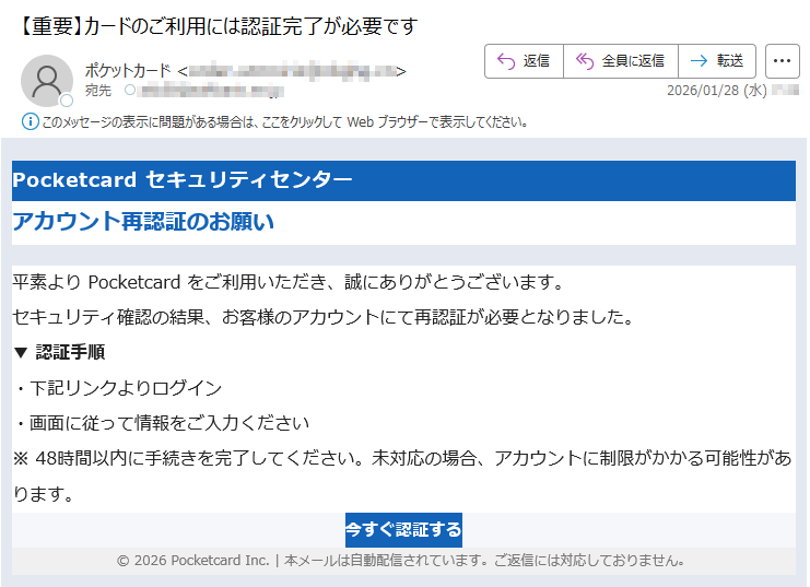 ポケットカードになりすました偽メール「件名:【セキュリティ強化】カード利用に認証が必要です」(本偽メールは、実在の企業と無関係に送信されたものです)