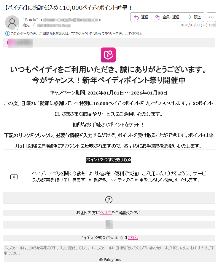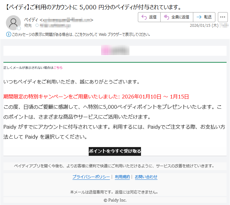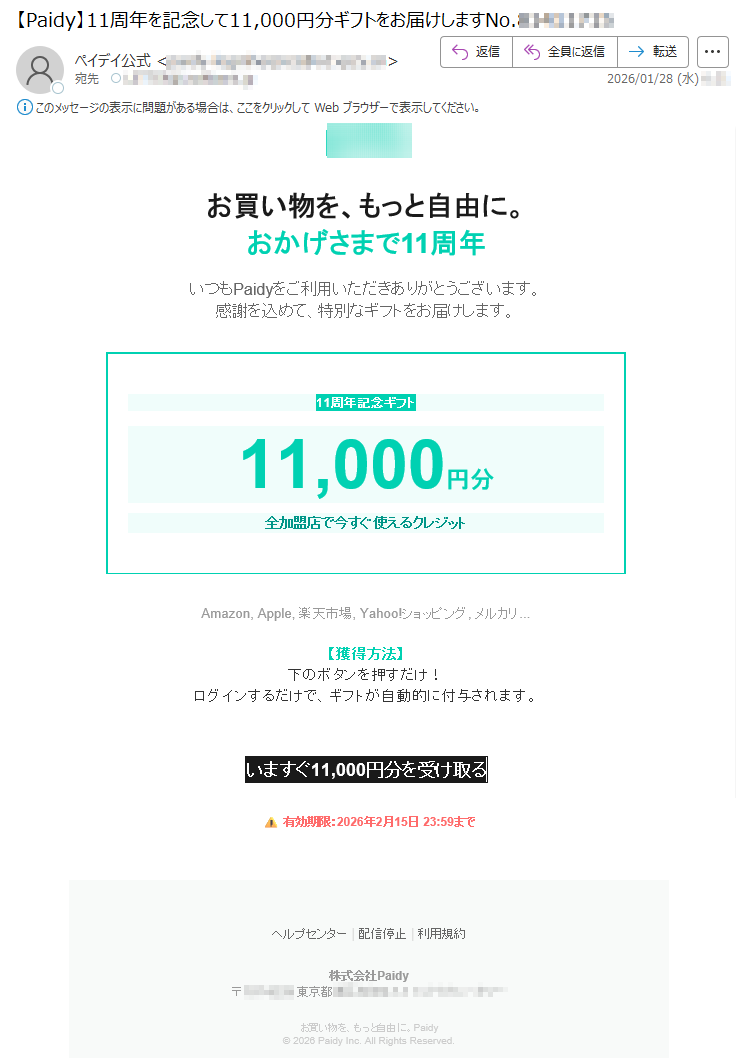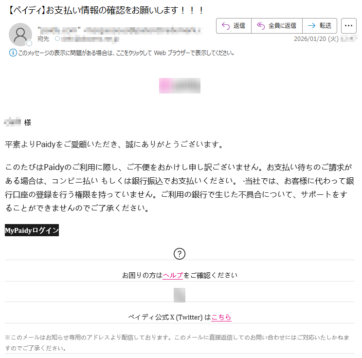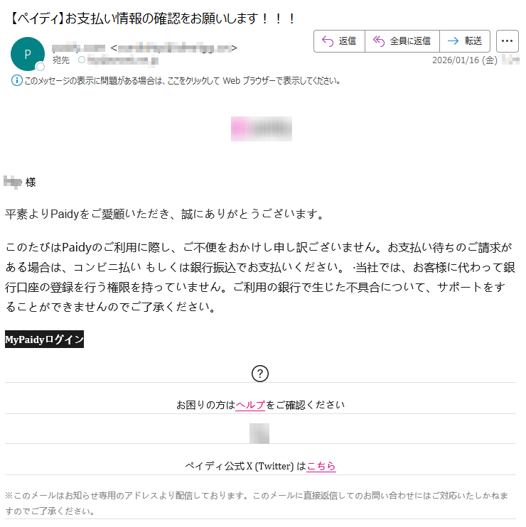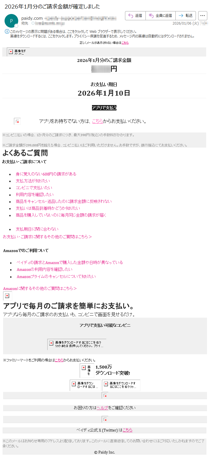 ペイディになりすました偽メール「件名:2026年1月分のご請求金額が確定しました」(本偽メールは、実在の企業と無関係に送信されたものです)