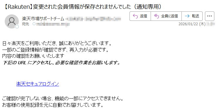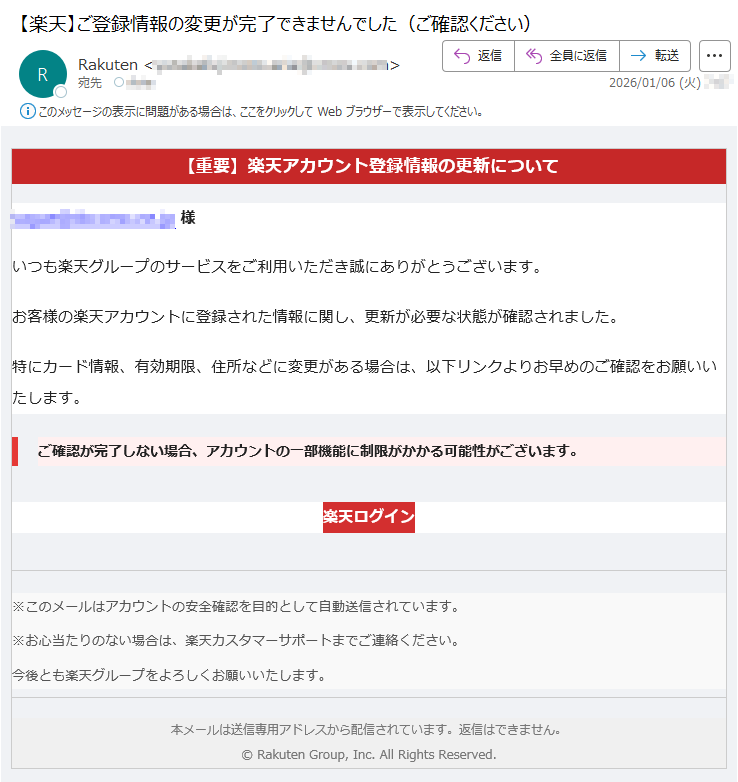 楽天になりすました偽メール「件名:【楽天】ご登録情報の変更が完了できませんでした(ご確認ください)」(本偽メールは、実在の企業と無関係に送信されたものです)