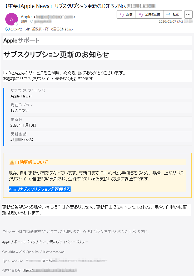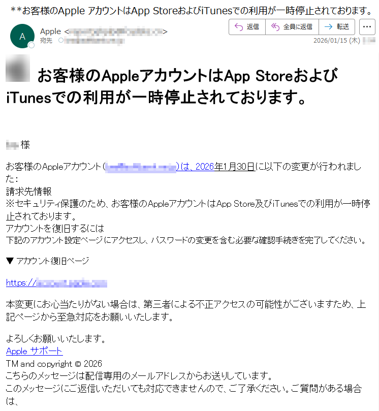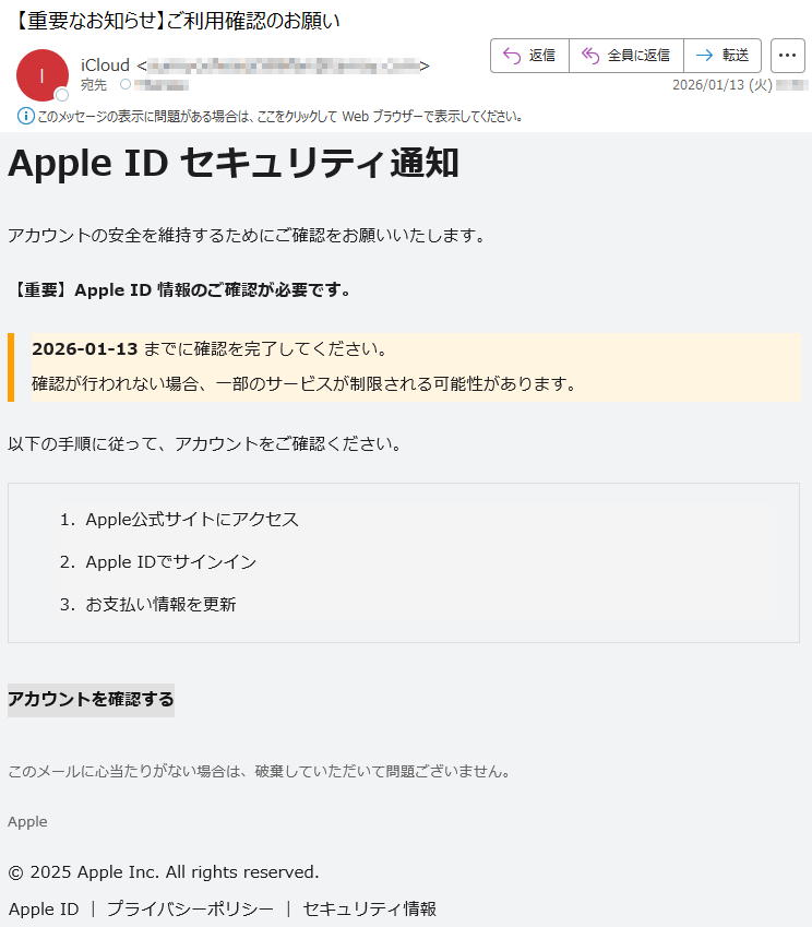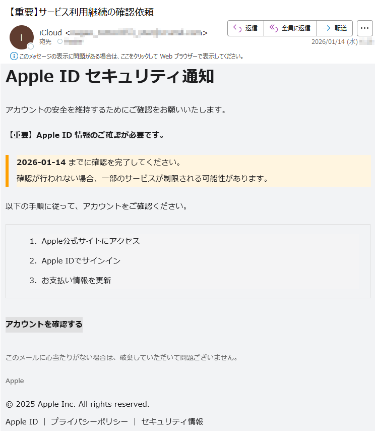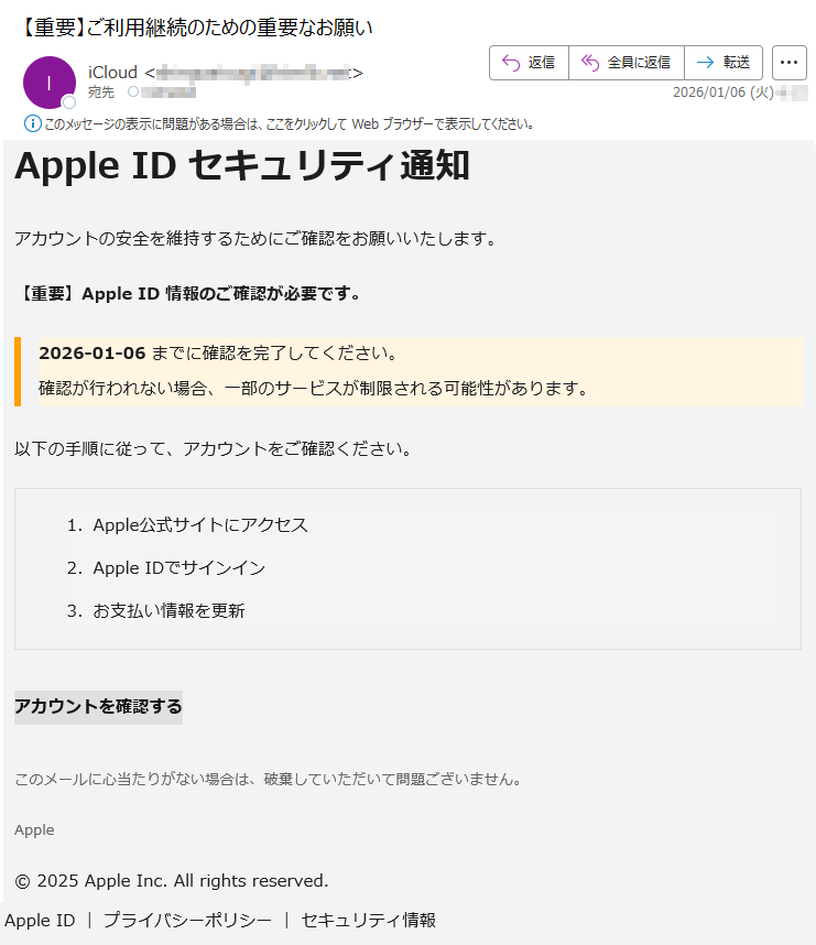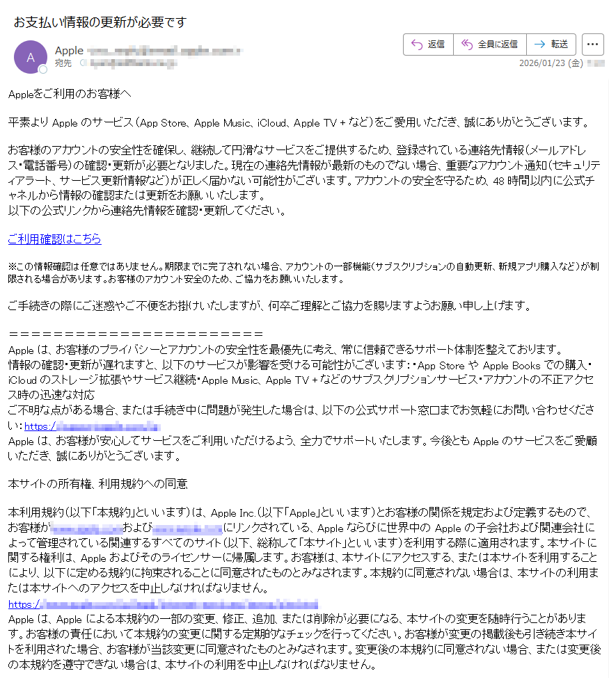 Appleになりすました偽メール「件名:【重要】ご利用継続のための重要なお願い」(本偽メールは、実在の企業と無関係に送信されたものです)