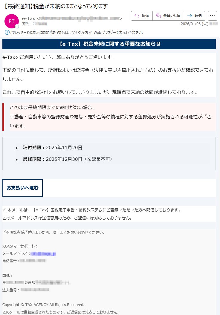 国税庁になりすました偽メール「件名:【最終通知】税金が未納のままとなっております」(本偽メールは、実在の企業と無関係に送信されたものです)