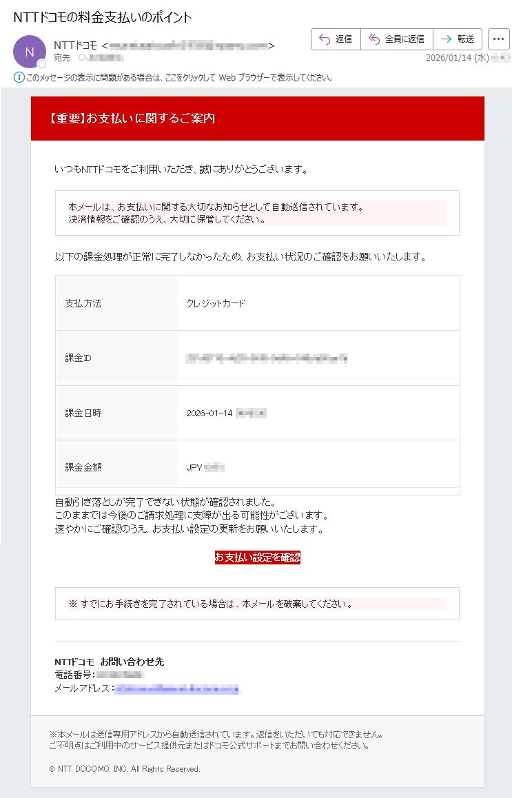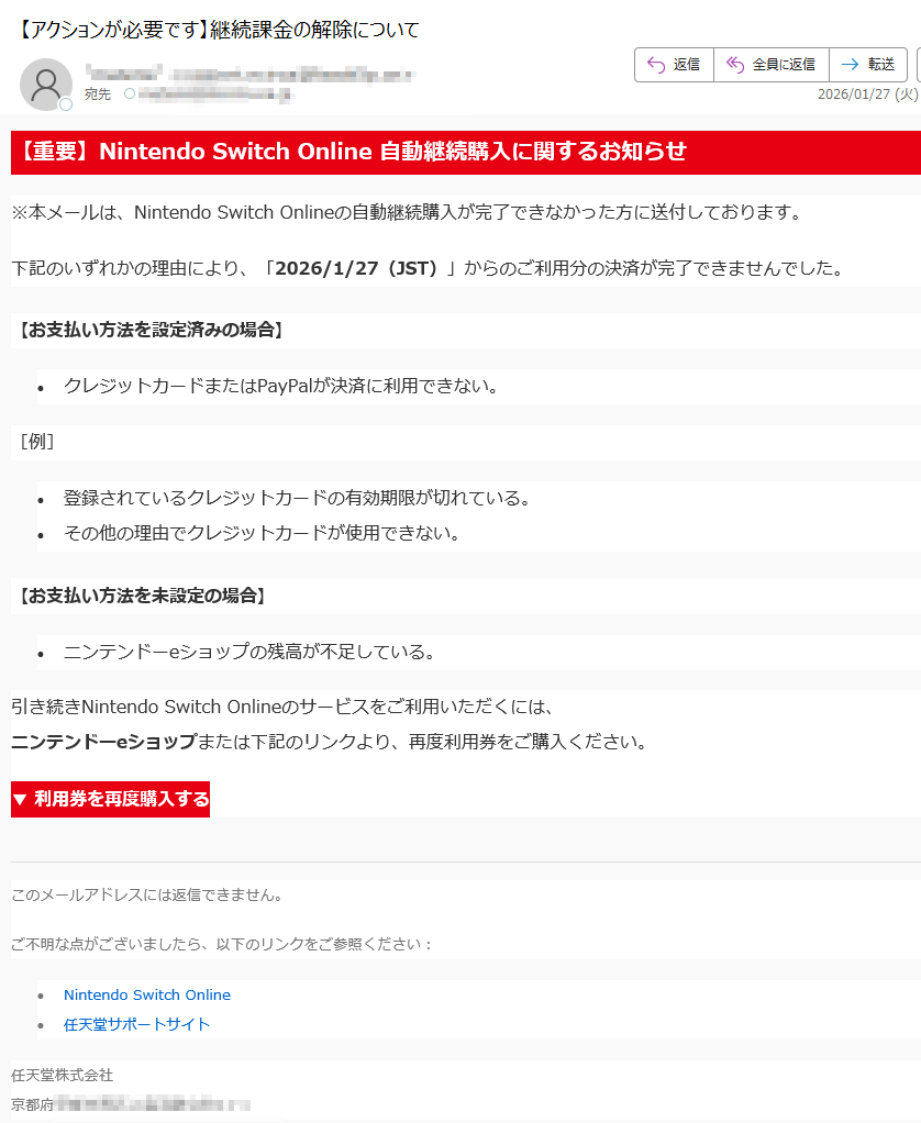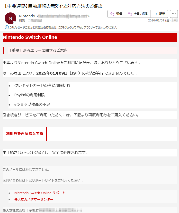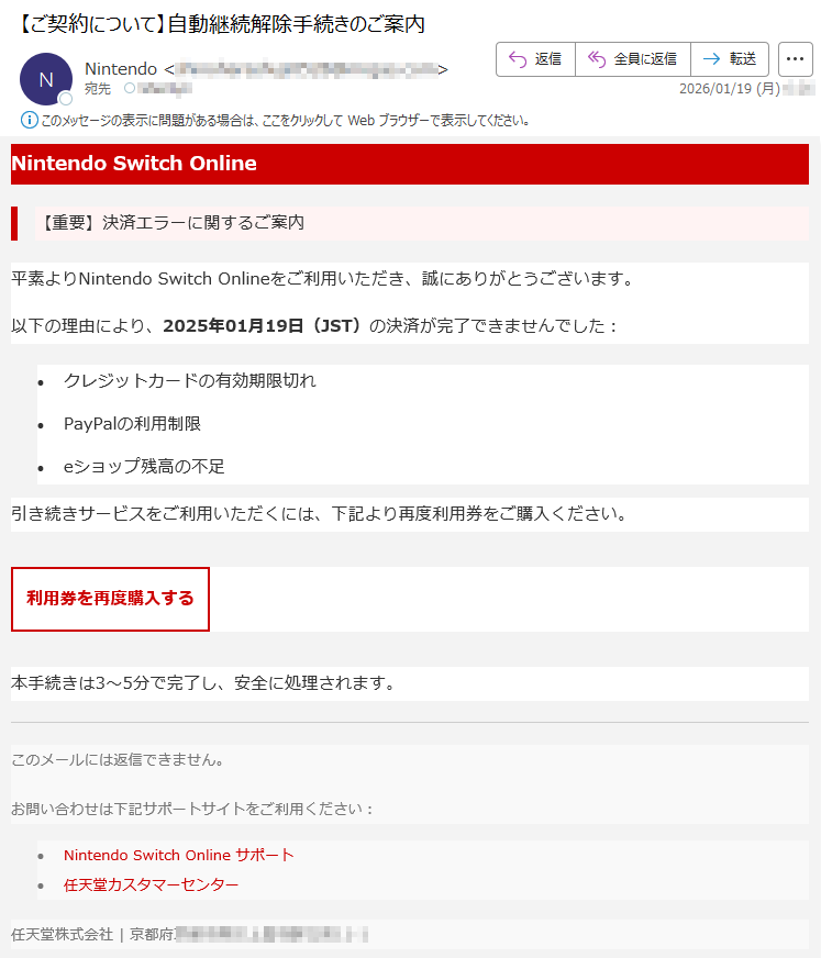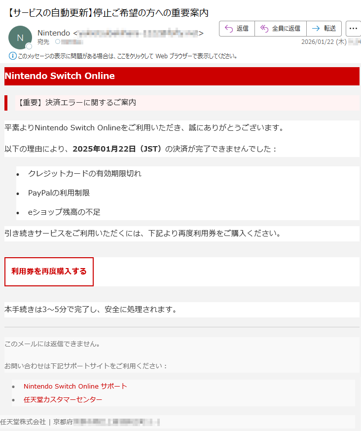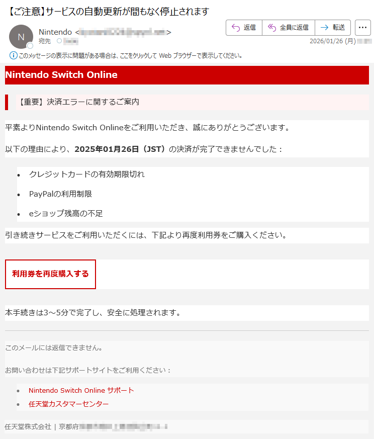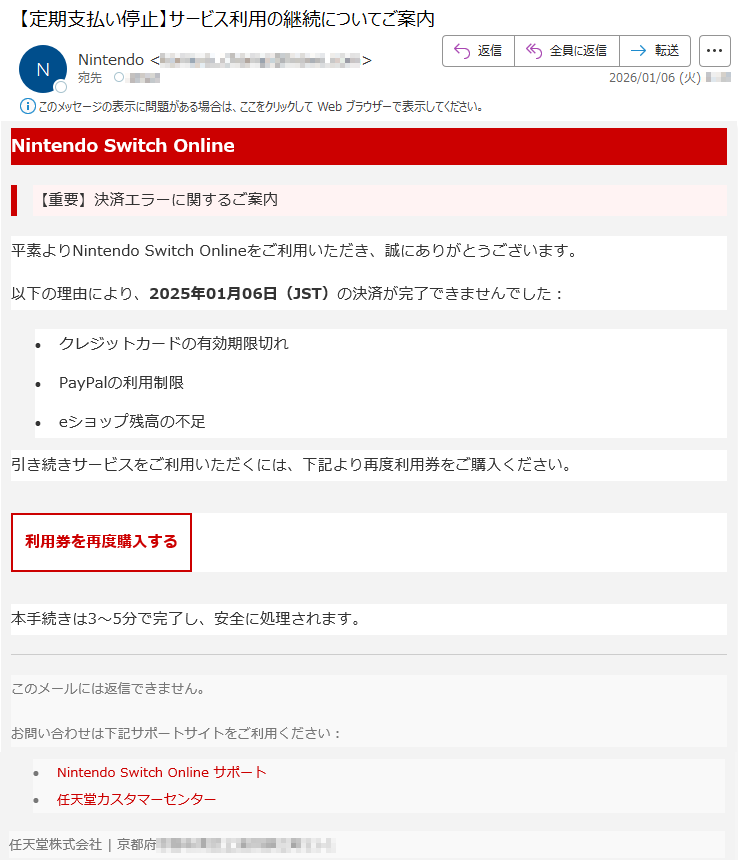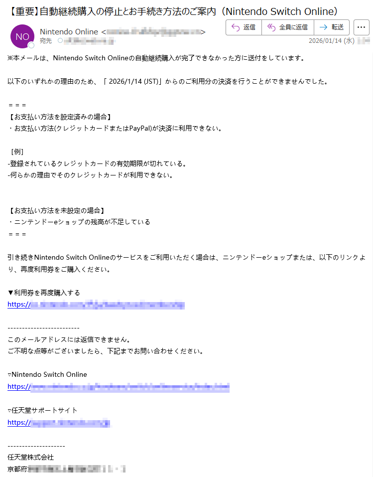 ![※本メールは、NintendoSwitchOnlineの自動継続購入が完了できなかった方に送付をしています。以下のいずれかの理由のため、「2026/1/14(JST)」からのご利用分の決済を行うことができませんでした。【お支払い方法を設定済みの場合】・お支払い方法(クレジットカードまたはPayPal)が決済に利用できない。[例]-登録されているクレジットカードの有効期限が切れている。-何らかの理由でそのクレジットカードが利用できない。【お支払い方法を未設定の場合】・ニンテンドーeショップの残高が不足している引き続きNintendoSwitchOnlineのサービスをご利用いただく場合は、ニンテンドーeショップまたは、以下のリンクより、再度利用券をご購入ください。▼利用券を再度購入するhttps://*****このメールアドレスには返信できません。ご不明な点等がございましたら、下記までお問い合わせください。▽NintendoSwitchOnlinehttps://*****▽任天堂サポートサイトhttps://*****任天堂株式会社京都府*****](../../../images/alert/2026/1m/nise_mail0114_17.png)