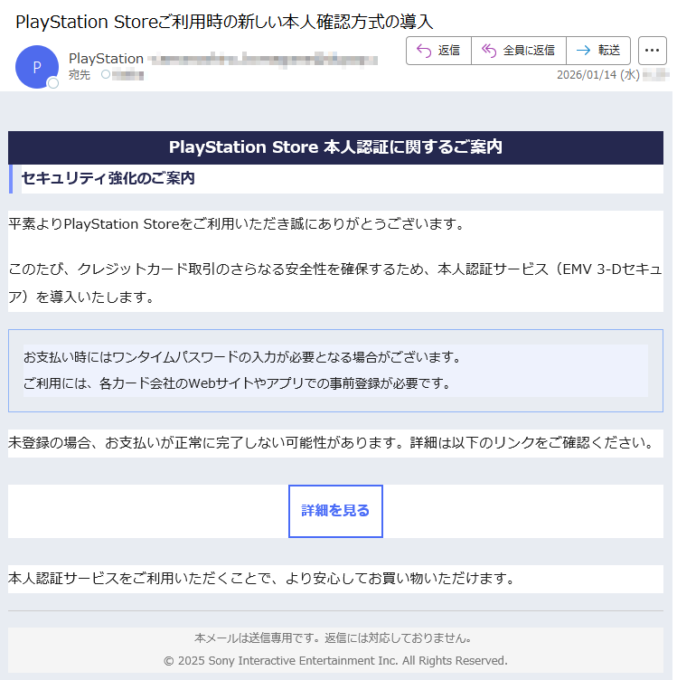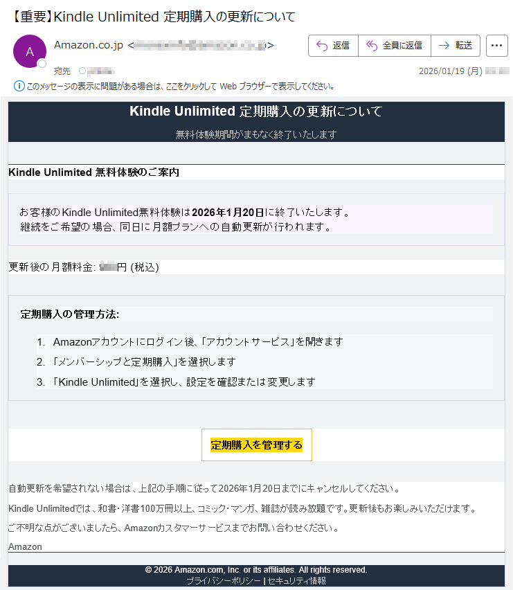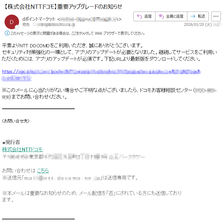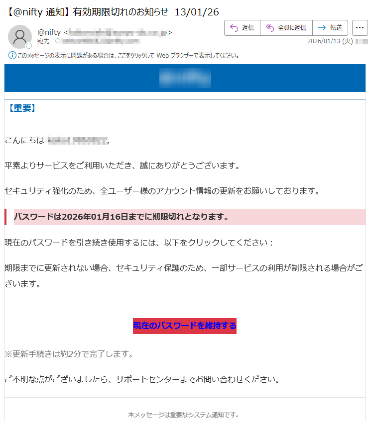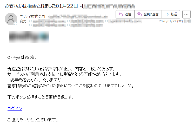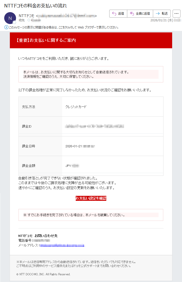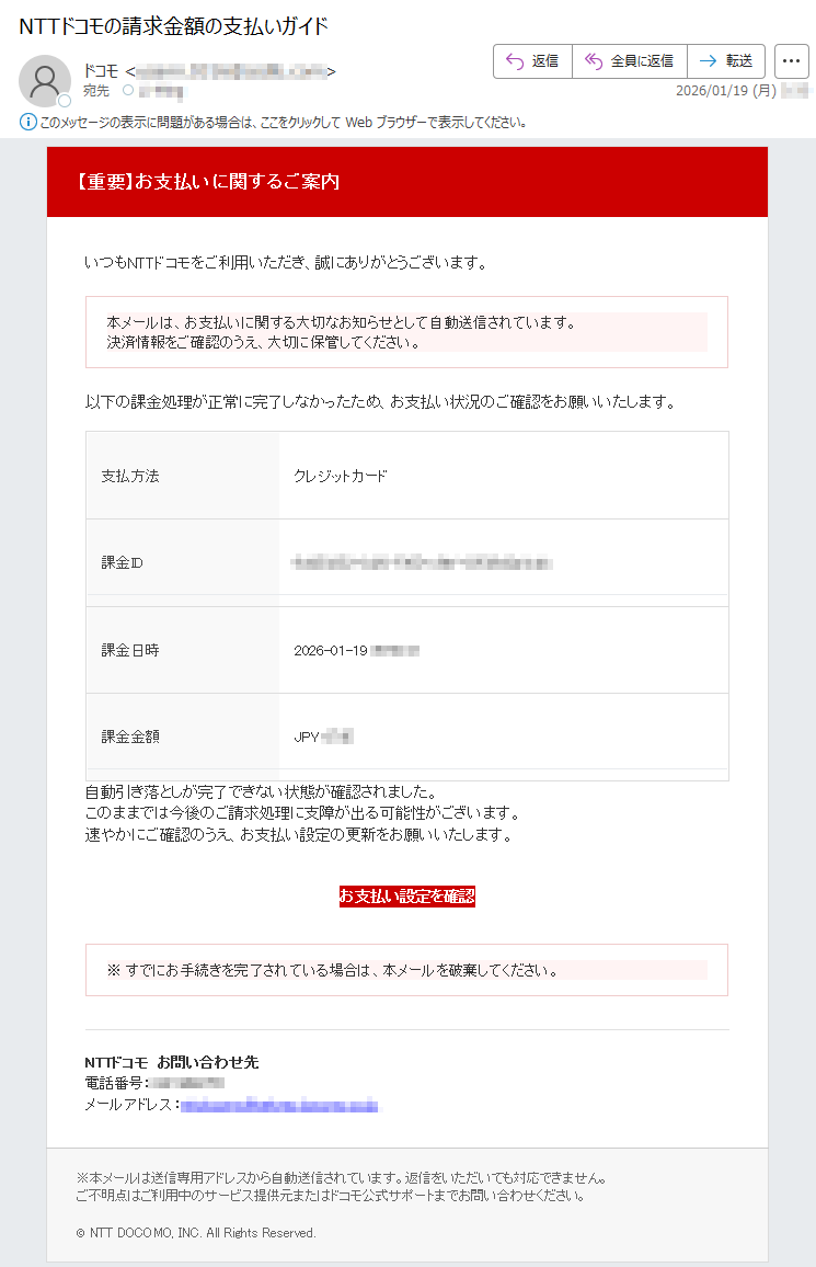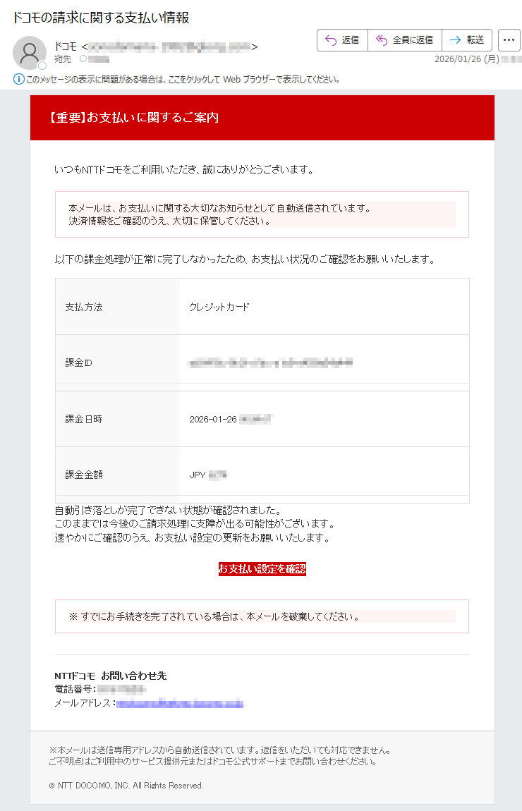![※本メールは、NintendoSwitchOnlineの自動継続購入が完了できなかった方に送付をしています。以下のいずれかの理由のため、「2026/1/14(JST)」からのご利用分の決済を行うことができませんでした。【お支払い方法を設定済みの場合】・お支払い方法(クレジットカードまたはPayPal)が決済に利用できない。[例]-登録されているクレジットカードの有効期限が切れている。-何らかの理由でそのクレジットカードが利用できない。【お支払い方法を未設定の場合】・ニンテンドーeショップの残高が不足している引き続きNintendoSwitchOnlineのサービスをご利用いただく場合は、ニンテンドーeショップまたは、以下のリンクより、再度利用券をご購入ください。▼利用券を再度購入するhttps://*****このメールアドレスには返信できません。ご不明な点等がございましたら、下記までお問い合わせください。▽NintendoSwitchOnlinehttps://*****▽任天堂サポートサイトhttps://*****任天堂株式会社京都府*****](../../../images/alert/2026/1m/nise_mail0114_17.png)