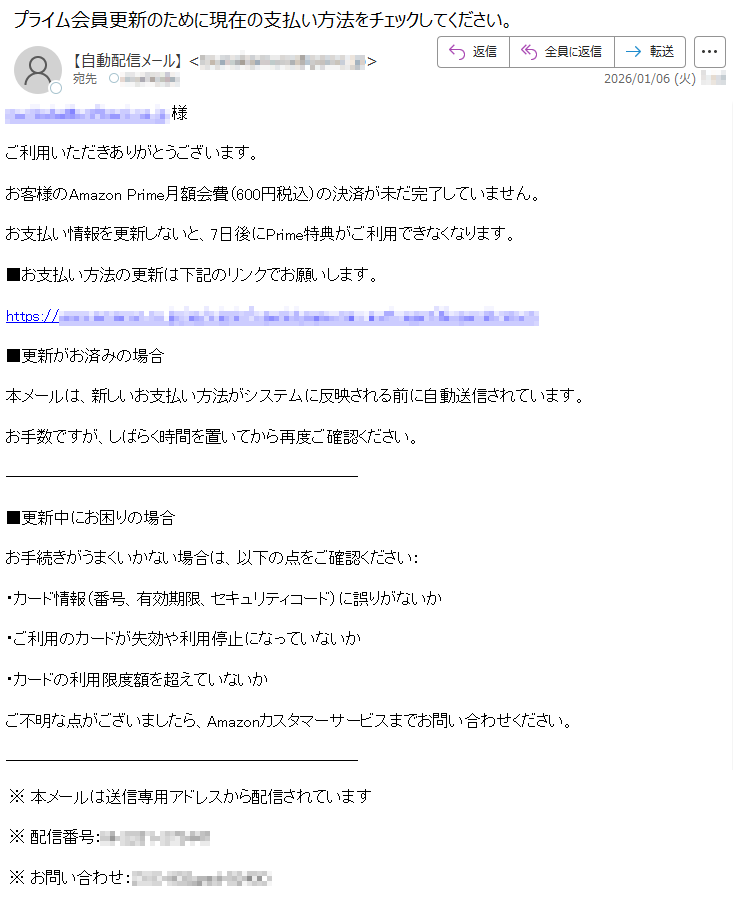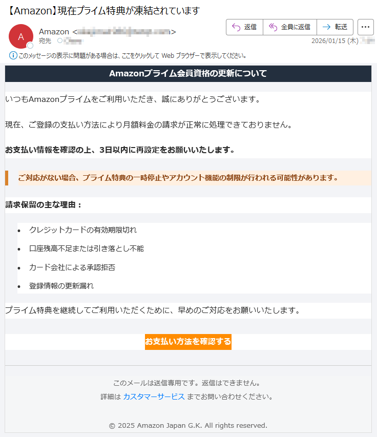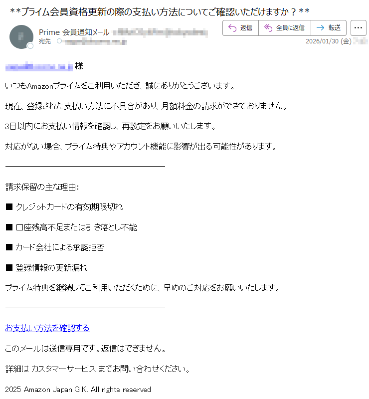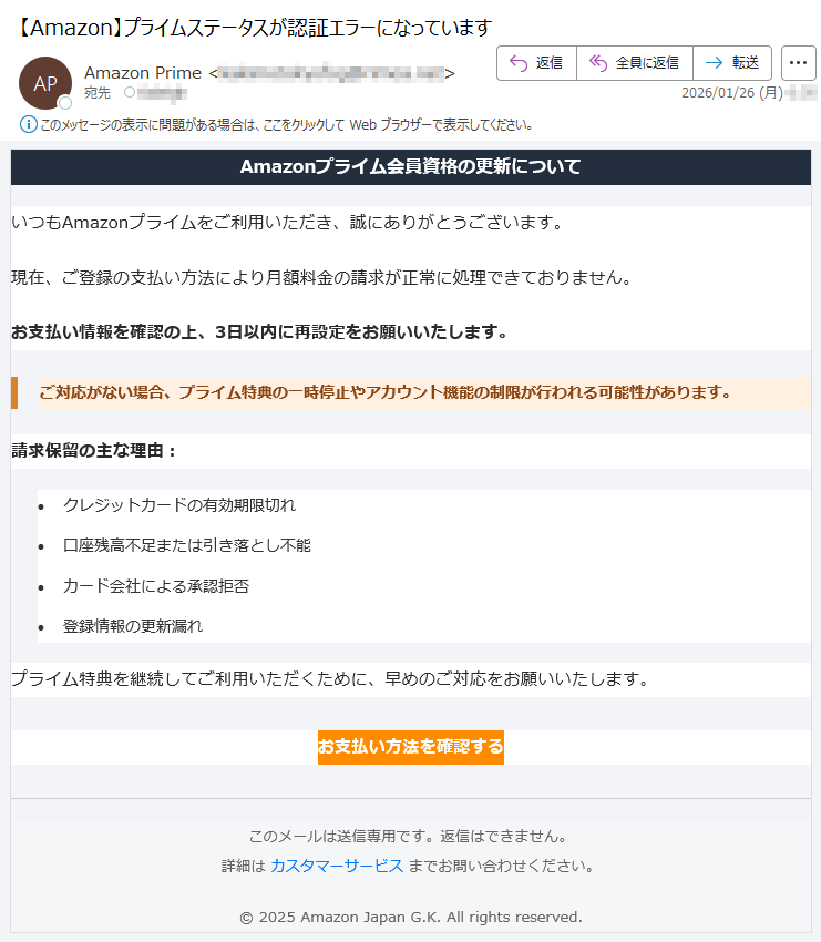 アマゾンになりすました偽メール「件名:プライム会員更新のために現在の支払い方法をチェックしてください。」(本偽メールは、実在の企業と無関係に送信されたものです)