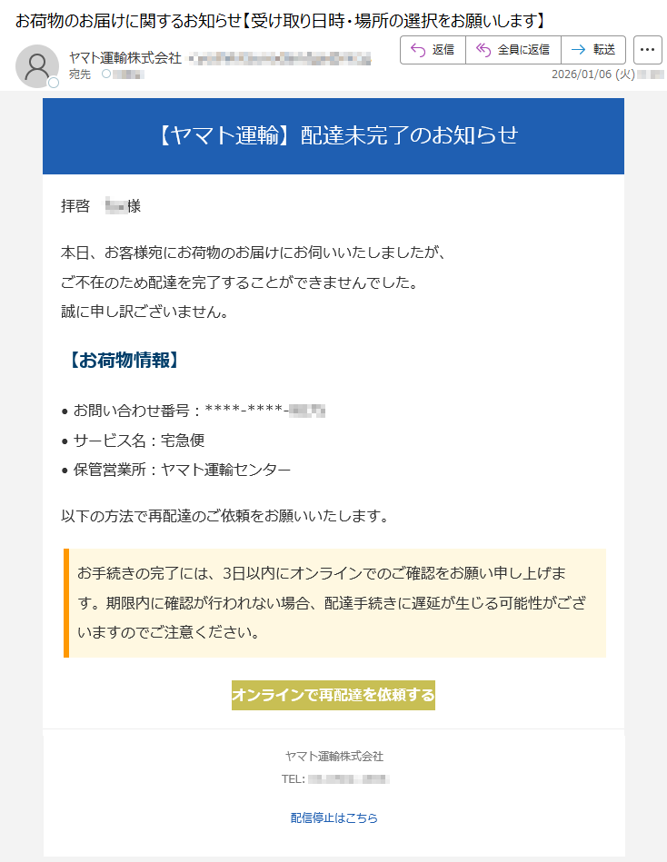 ヤマト運輸になりすました偽メール「件名:お荷物のお届けに関するお知らせ【受け取り日時・場所の選択をお願いします】」(本偽メールは、実在の企業と無関係に送信されたものです)