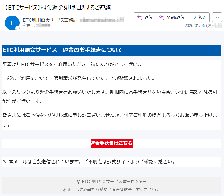 ETC利用照会サービスになりすました偽メール「件名:【ETCサービス】料金返金処理に関するご連絡」(本偽メールは、実在の企業と無関係に送信されたものです)