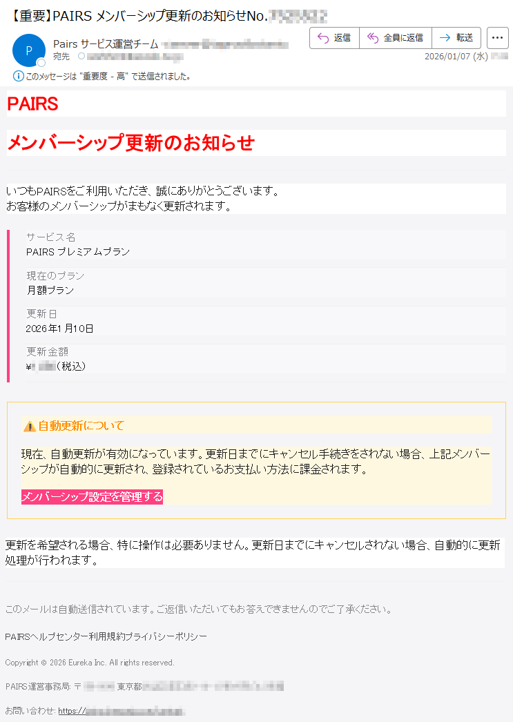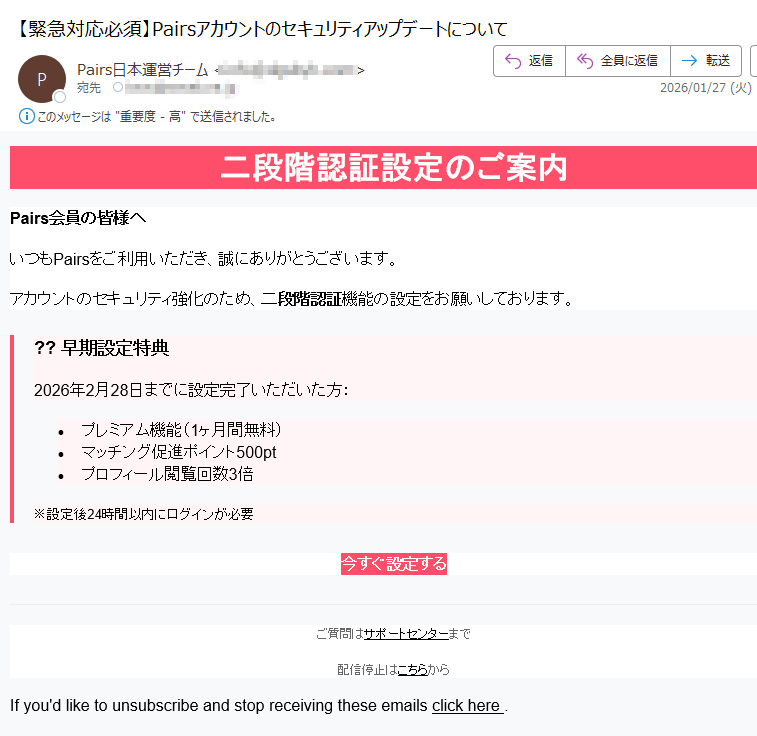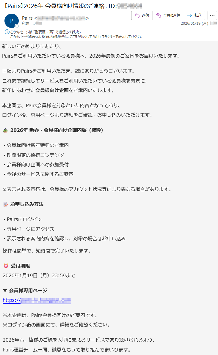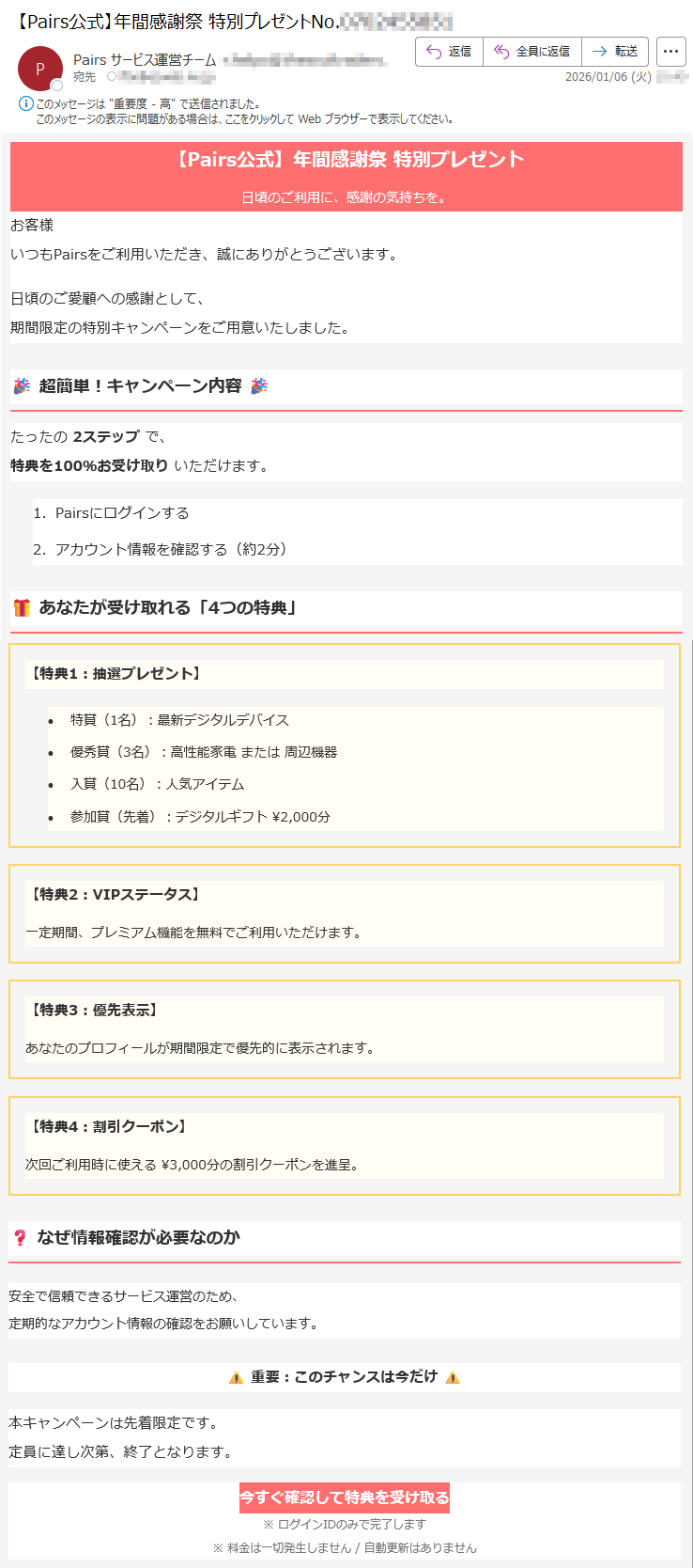 Pairsになりすました偽メール「件名:【Pairs公式】年間感謝祭 特別プレゼントNo.*****」(本偽メールは、実在の企業と無関係に送信されたものです)