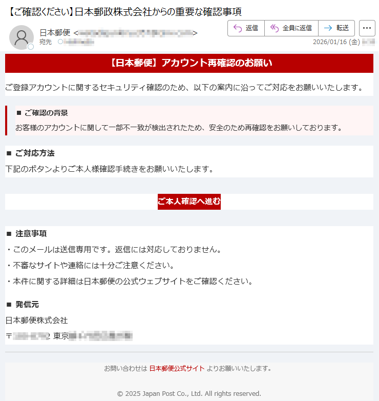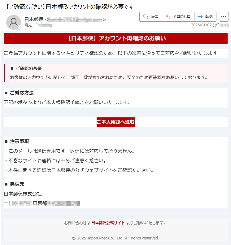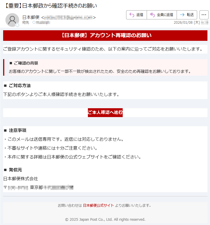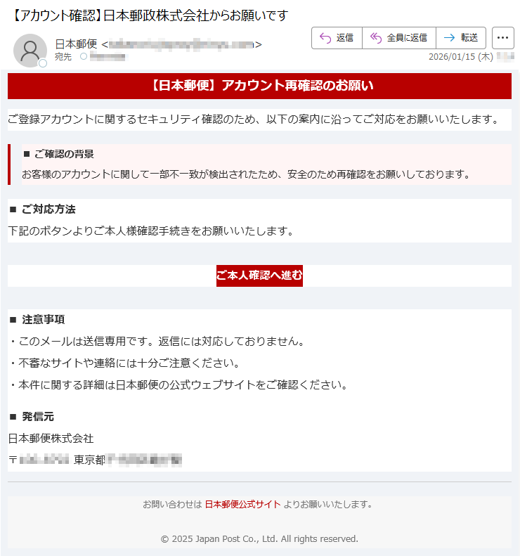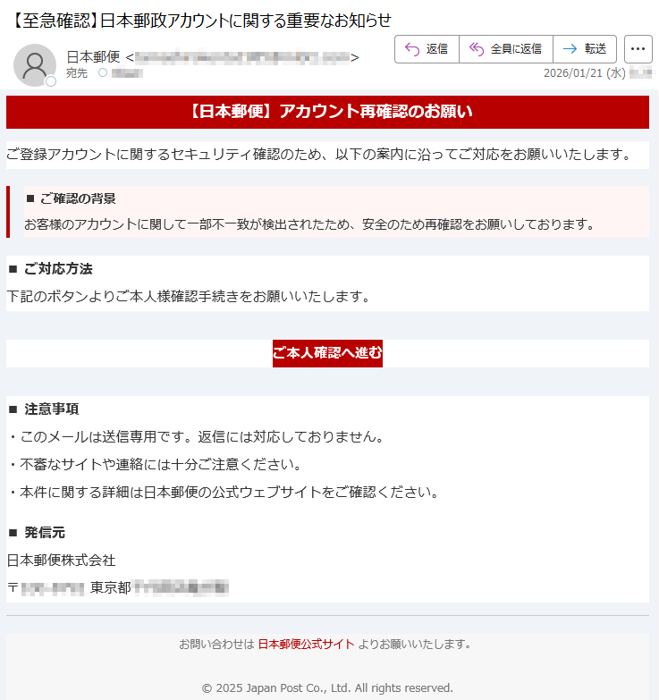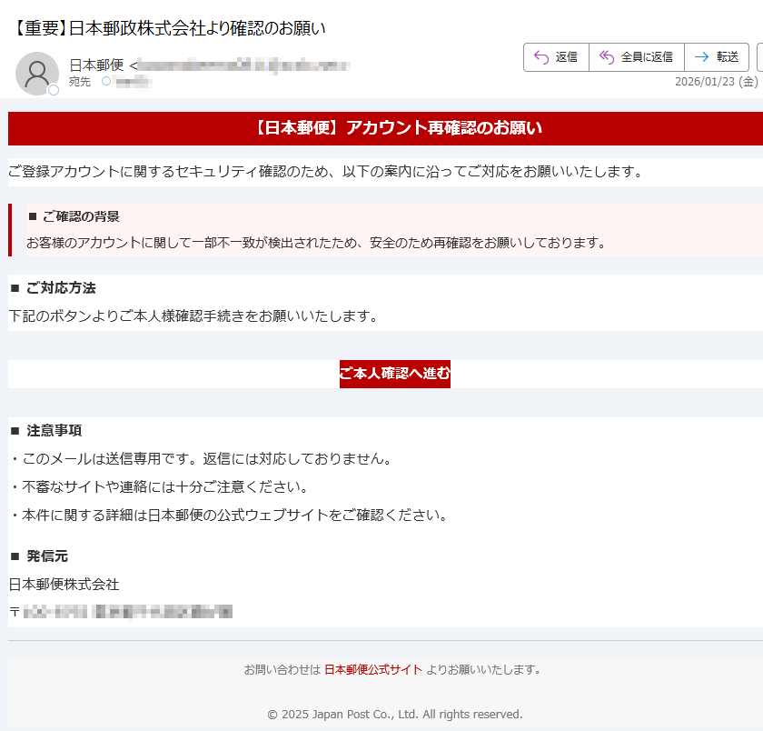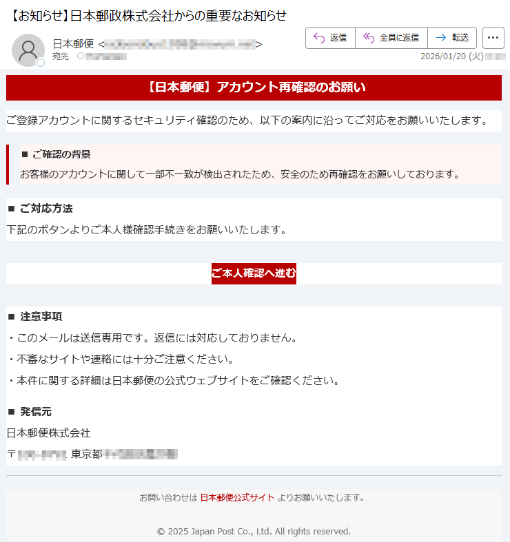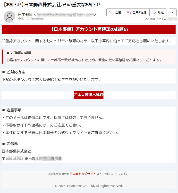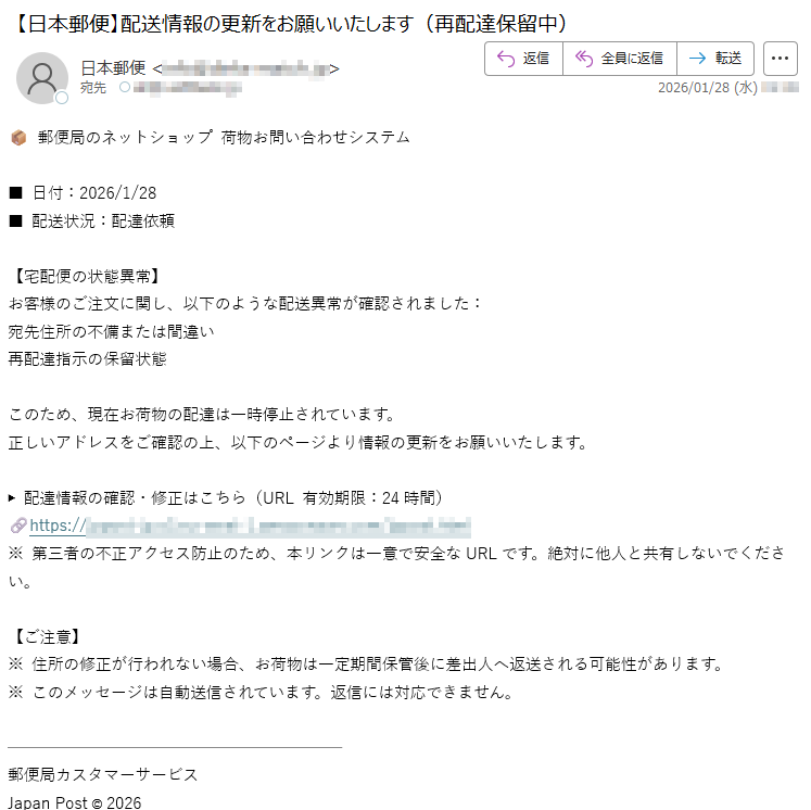 日本郵便になりすました偽メール「件名:【日本郵便】配送情報の更新をお願いいたします(再配達保留中)」(本偽メールは、実在の企業と無関係に送信されたものです)