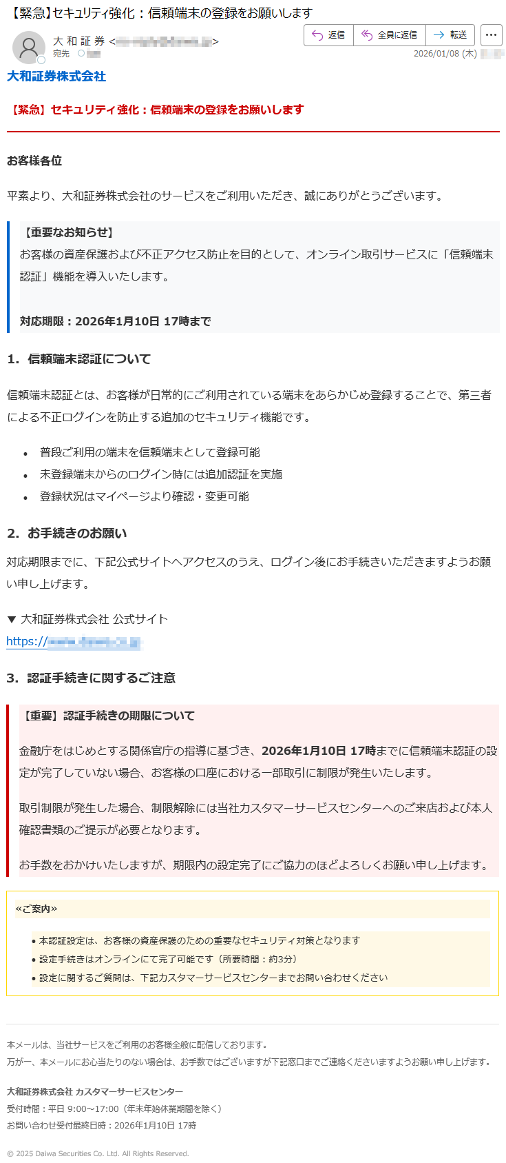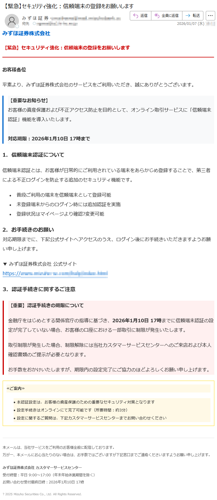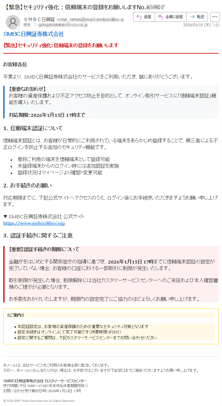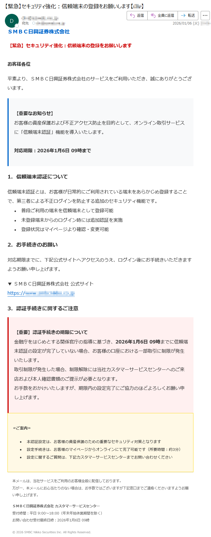 ![SMBC日興証券株式会社【緊急】セキュリティ強化:信頼端末の登録をお願いしますお客様各位平素より、SMBC日興証券株式会社のサービスをご利用いただき、誠にありがとうございます。【重要なお知らせ】お客様の資産保護および不正アクセス防止を目的として、オンライン取引サービスに「信頼端末認証」機能を導入いたします。対応期限:2026年01月10日09時まで1.信頼端末認証について信頼端末認証とは、お客様が日常的にご利用されている端末をあらかじめ登録することで、第三者による不正ログインを防止する追加のセキュリティ機能です。•普段ご利用の端末を信頼端末として登録可能•未登録端末からのログイン時には追加認証を実施•登録状況はマイページより確認・変更可能2.お手続きのお願い対応期限までに、下記公式サイトへアクセスのうえ、ログイン後にお手続きいただきますようお願い申し上げます。▼SMBC日興証券株式会社公式サイト[https://*****]【重要】認証手続きの期限について金融庁をはじめとする関係官庁の指導に基づき、2026年01月10日09時までに信頼端末認証の設定が完了していない場合、お客様の口座における一部取引に制限が発生いたします。取引制限が発生した場合、制限解除には当社カスタマーサービスセンターへのご来店および本人確認書類のご提示が必要となります。期限内の設定完了にご協力くださいますようお願い申し上げます。≪ご案内≫•本認証設定は資産保護のための重要なセキュリティ対策です•設定手続きはマイページからオンラインで完了可能です(約3分)•ご不明点はカスタマーサービスセンターまでお問い合わせください本メールは、当社サービスをご利用のお客様全般に配信しております。万が一、本メールにお心当たりのない場合は、お手数ではございますが下記窓口までご連絡ください。SMBC日興証券株式会社カスタマーサービスセンター受付時間:平日9:00~18:00(年末年始を除く)お問い合わせ受付最終日時:2026年01月10日09時©2026SMBCNikkoSecuritiesInc.AllRightsReserved.](../../../images/alert/2026/1m/nise_mail0109_04.png)