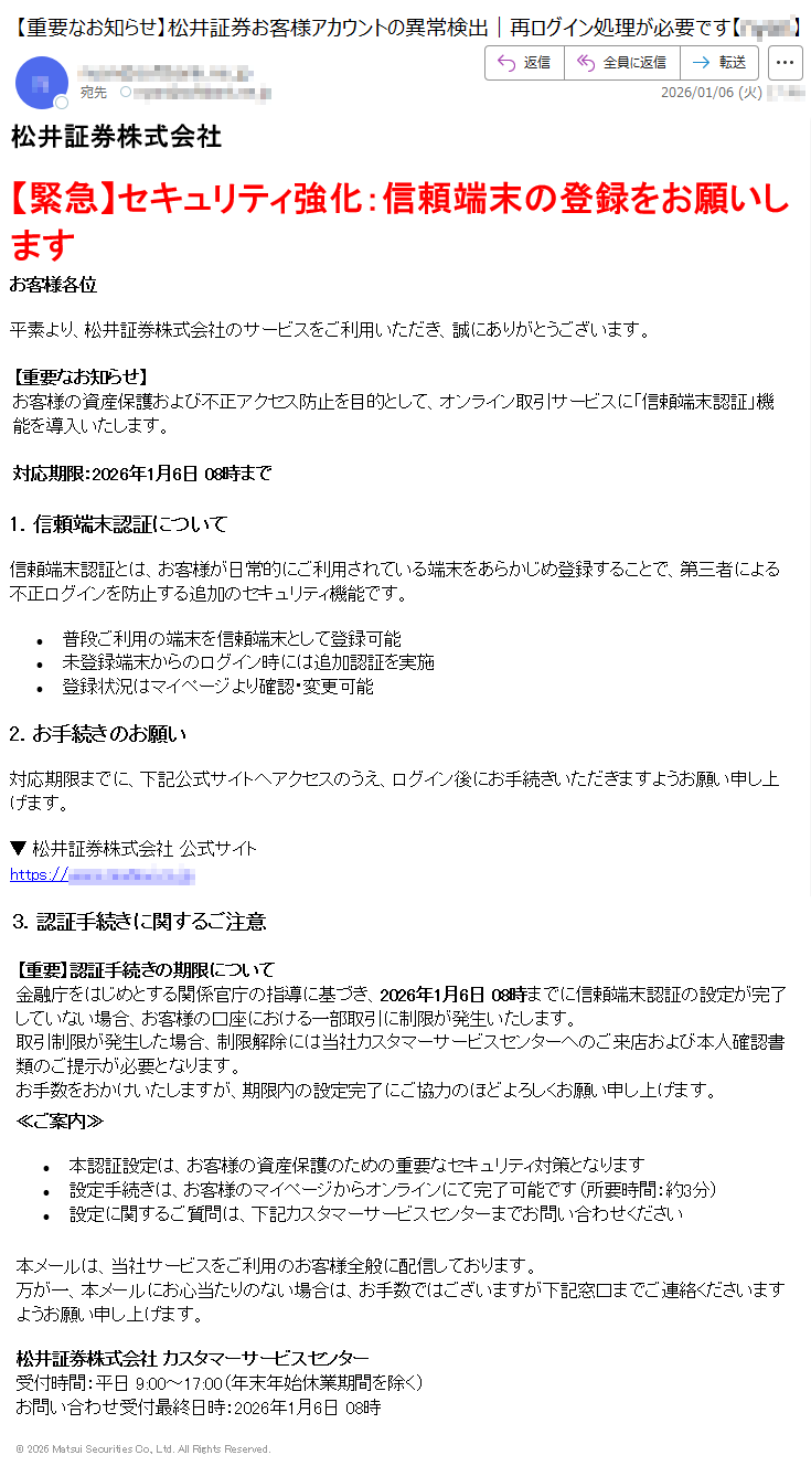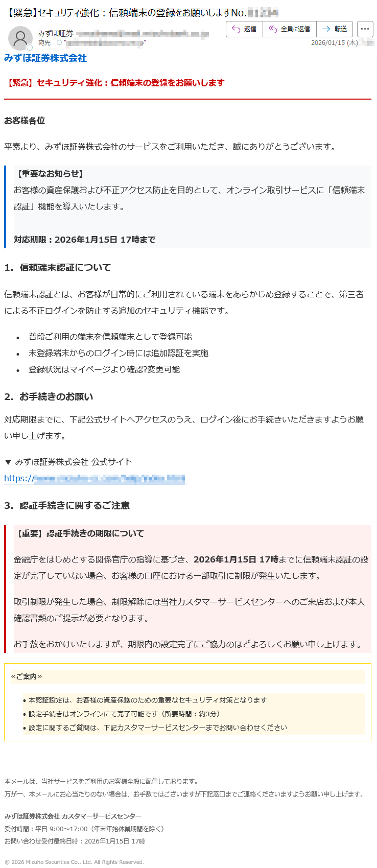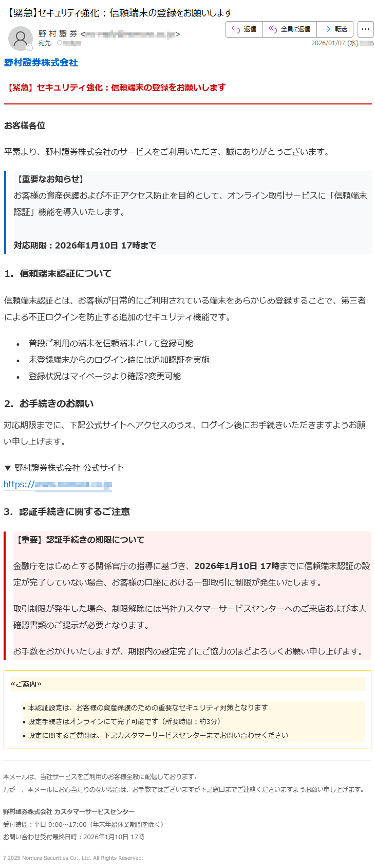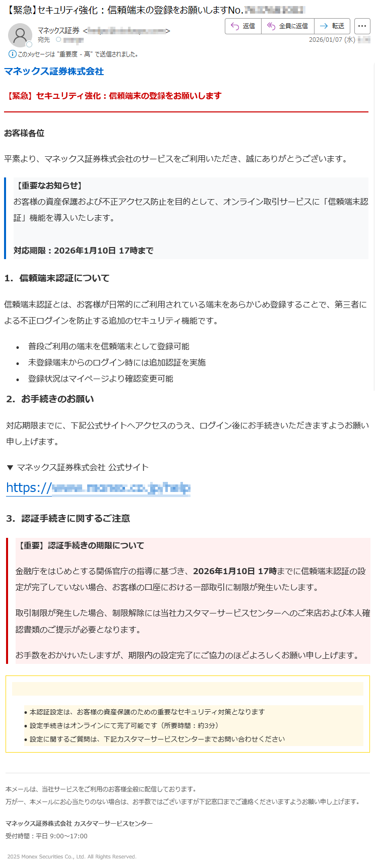 ![SMBC日興証券株式会社【緊急】セキュリティ強化:信頼端末の登録をお願いしますお客様各位平素より、SMBC日興証券株式会社のサービスをご利用いただき、誠にありがとうございます。【重要なお知らせ】お客様の資産保護および不正アクセス防止を目的として、オンライン取引サービスに「信頼端末認証」機能を導入いたします。対応期限:2026年01月10日09時まで1.信頼端末認証について信頼端末認証とは、お客様が日常的にご利用されている端末をあらかじめ登録することで、第三者による不正ログインを防止する追加のセキュリティ機能です。•普段ご利用の端末を信頼端末として登録可能•未登録端末からのログイン時には追加認証を実施•登録状況はマイページより確認・変更可能2.お手続きのお願い対応期限までに、下記公式サイトへアクセスのうえ、ログイン後にお手続きいただきますようお願い申し上げます。▼SMBC日興証券株式会社公式サイト[https://*****]【重要】認証手続きの期限について金融庁をはじめとする関係官庁の指導に基づき、2026年01月10日09時までに信頼端末認証の設定が完了していない場合、お客様の口座における一部取引に制限が発生いたします。取引制限が発生した場合、制限解除には当社カスタマーサービスセンターへのご来店および本人確認書類のご提示が必要となります。期限内の設定完了にご協力くださいますようお願い申し上げます。≪ご案内≫•本認証設定は資産保護のための重要なセキュリティ対策です•設定手続きはマイページからオンラインで完了可能です(約3分)•ご不明点はカスタマーサービスセンターまでお問い合わせください本メールは、当社サービスをご利用のお客様全般に配信しております。万が一、本メールにお心当たりのない場合は、お手数ではございますが下記窓口までご連絡ください。SMBC日興証券株式会社カスタマーサービスセンター受付時間:平日9:00~18:00(年末年始を除く)お問い合わせ受付最終日時:2026年01月10日09時©2026SMBCNikkoSecuritiesInc.AllRightsReserved.](../../../images/alert/2026/1m/nise_mail0109_04.png)